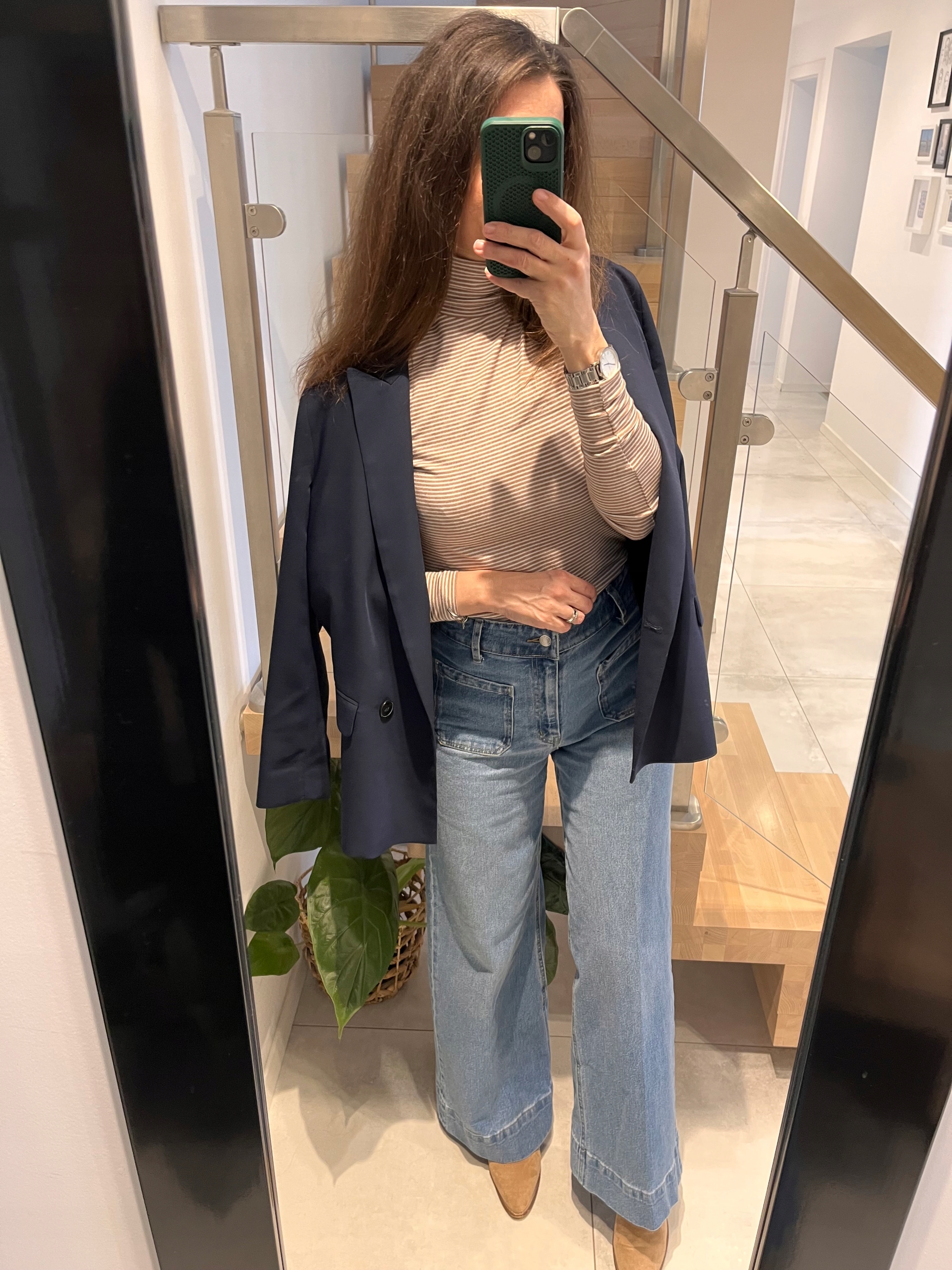 Гольф кремовой блузки с полосатым бежевым, сочетающимся с водолазкой с джинсами M 38
