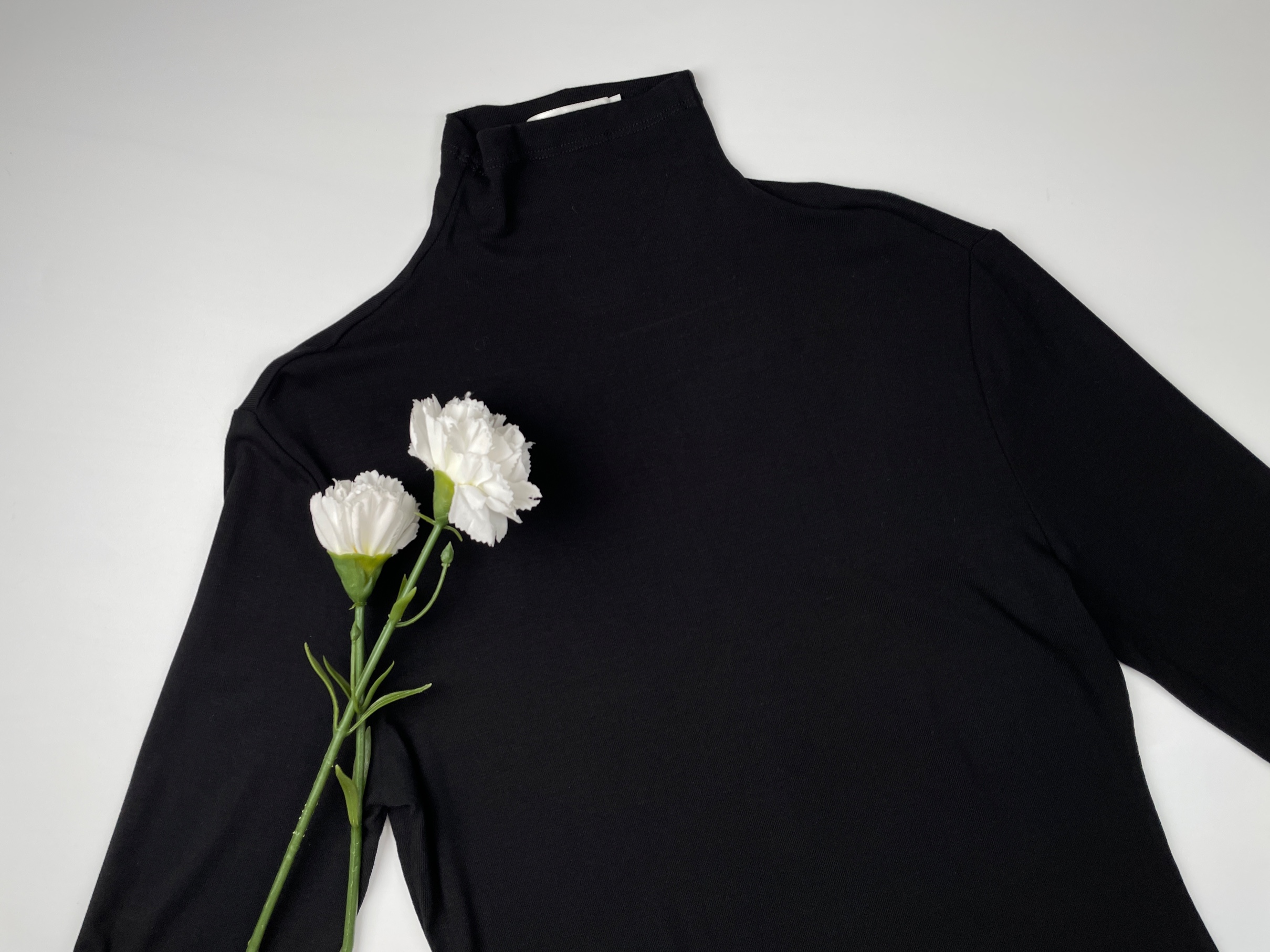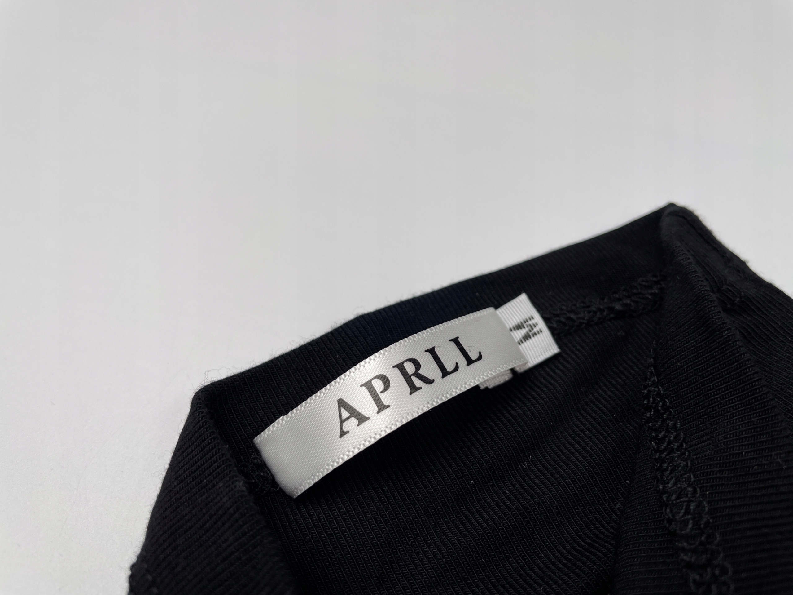 - Женский гольф от Aprll. Это гладко, в классическом черном. У него простой, облегающий порез, есть короткий голгик- в стиле стойкого воротника. Он был сделан из приятного на ощупь, ребристого и гибкого материала.
