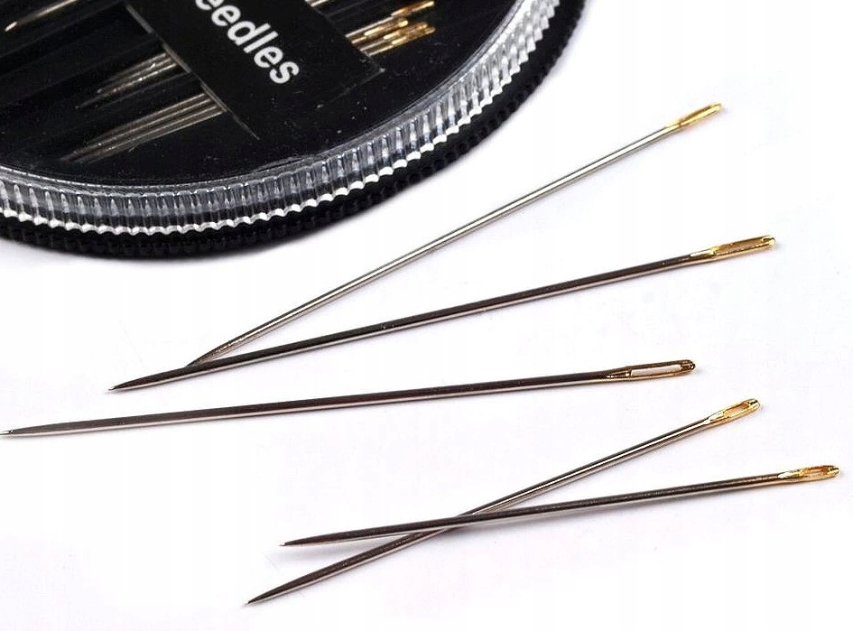 Компактная коробка с иглами различной длины. В одной коробке содержится 30 штук игл. На иголках имеются золотые ушки, чтобы их было легче вдевать.