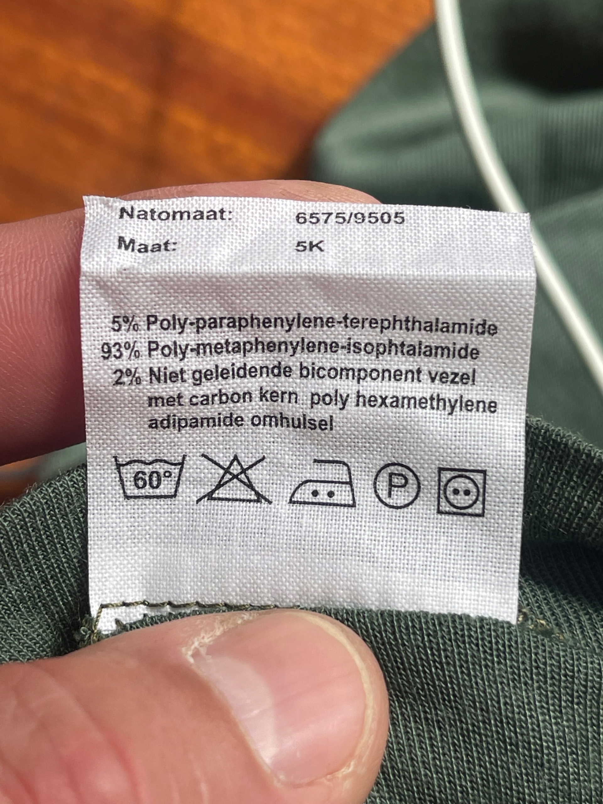 Материал: 93% полиметафенилизофталамид, 5% полипарафенилентерефталамид, 2% непроводящий бикомпонент. волокно с углеродным сердечником и оболочкой из полигексаметилендипамида.