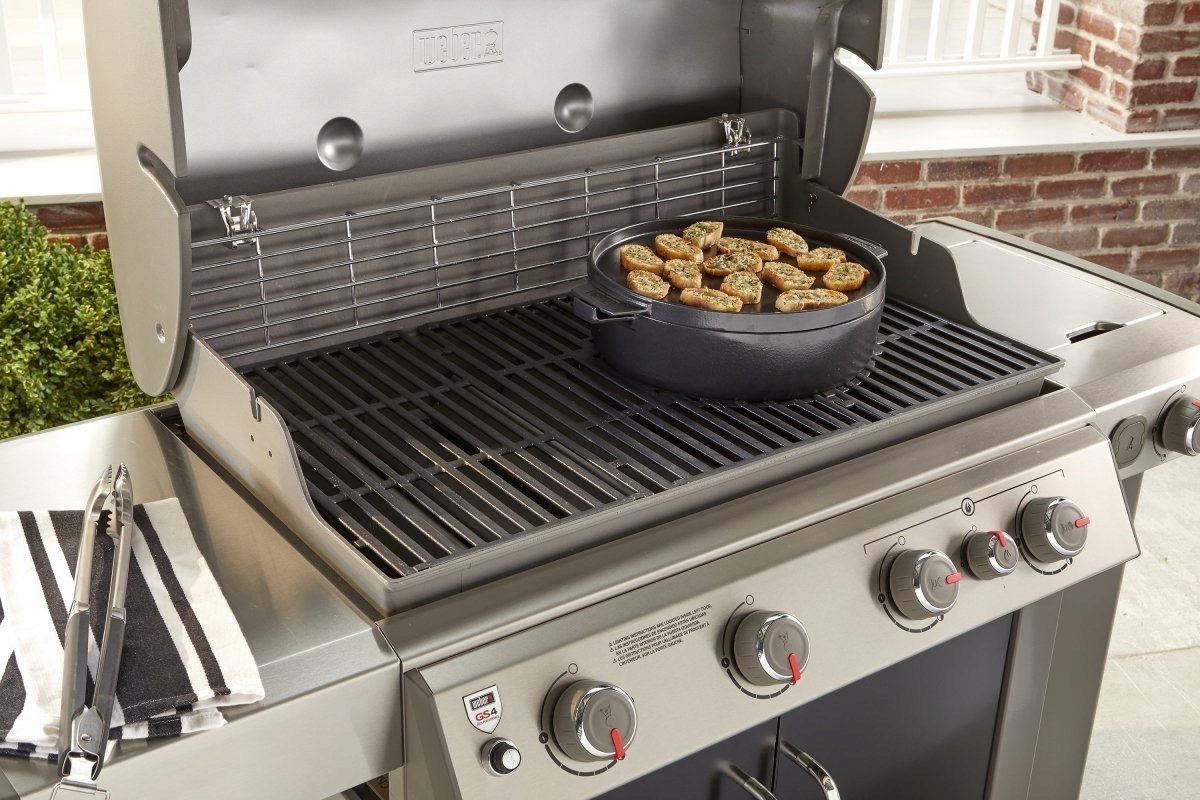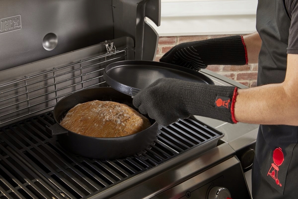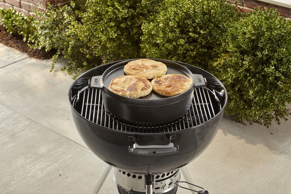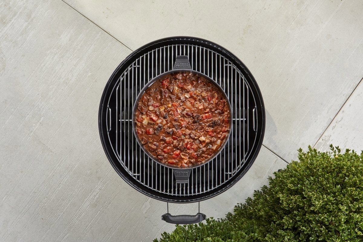 Предназначен для использования с решетками Gourmet BBQ System Вебер 8857 Эта многофункциональная посуда открывает безграничные возможности при приготовлении на гриле. Чугунная кастрюля объемом 6,8 л обеспечивает равномерное распределение и сохранение тепла при приготовлении нежного жаркого, вкусных супов или тушеных блюд. Двойную крышку можно использовать в качестве противня для поджаривания сэндвичей или идеального запекания куриных грудок и овощей. Фарфоровая эмаль обеспечивает легкую очистку, а обе части можно складывать друг на друга, экономя место при хранении.