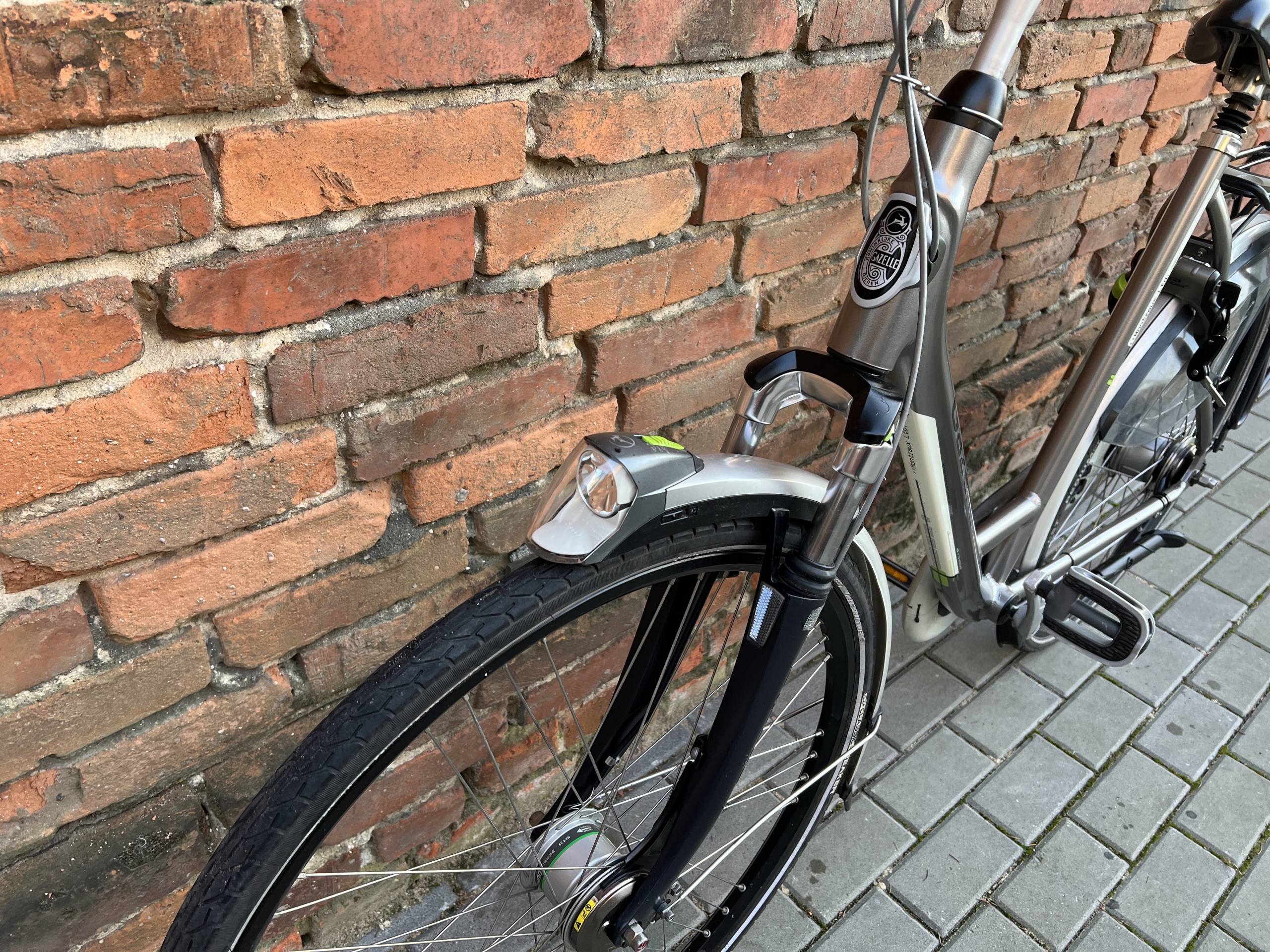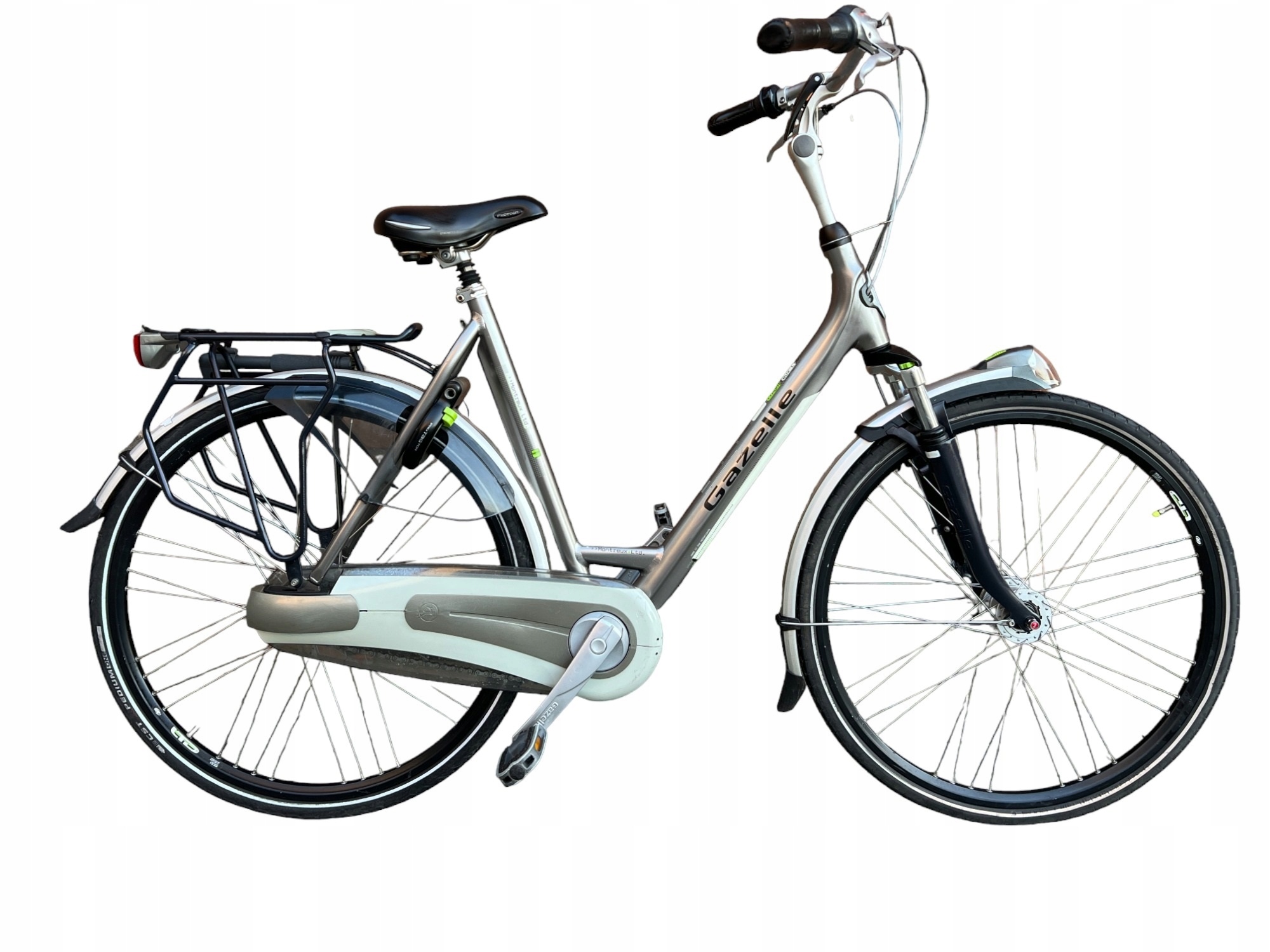 Комплектация: 8-скоростная втулка Shimano Nexus, динамо-втулка, светодиодное освещение, амортизационная вилка, блокировка заднего колеса, регулируемый без ключей вынос руля, полный чехол цепи, алюминиевая рама, мягкий подседельный штырь, боковые чехлы на заднее колесо, роликовые тормоза, оригинальная помпа Газель, гелевое седло Selle Royal, покрышки CST со светоотражающей полосой в хорошем состоянии