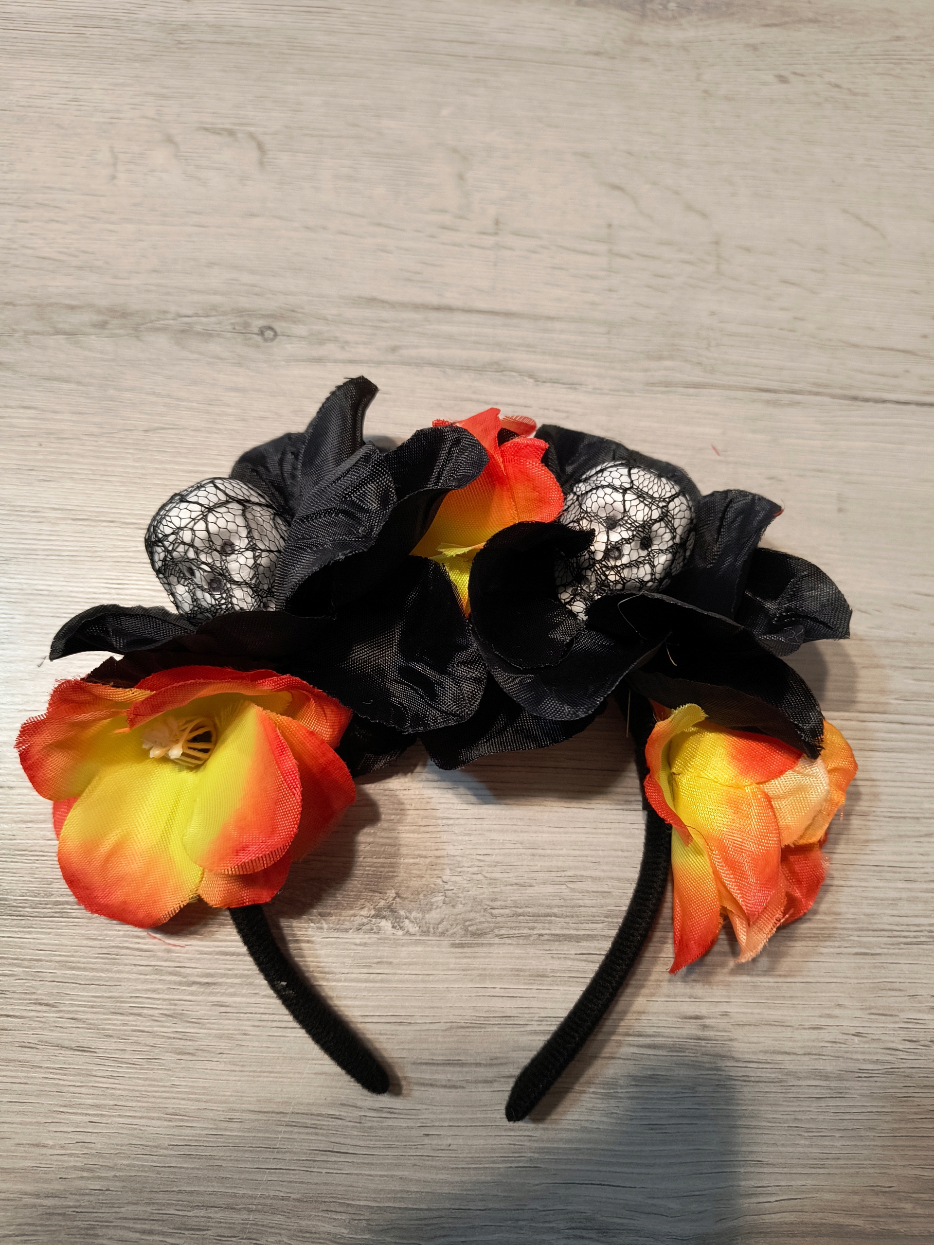 Повязка на голову украшена элегантными розами, которые придают ей драматический, готический характер. Цветы контрастируют с черепом, создавая идеальное сочетание темной элегантности.