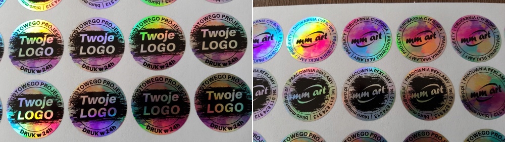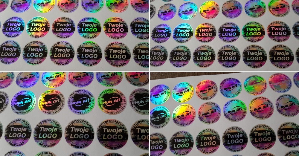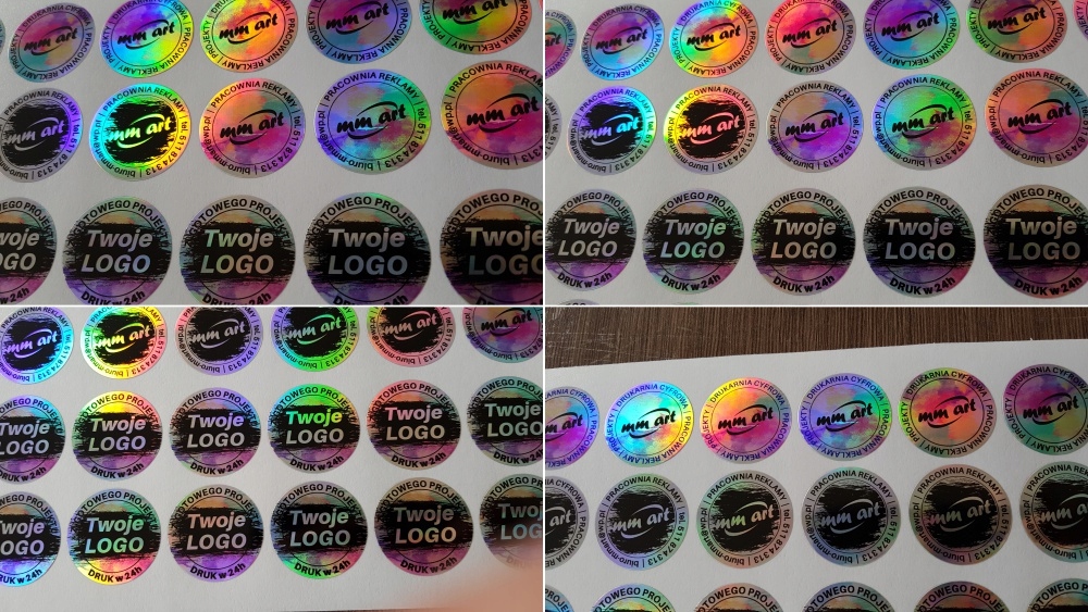 Призматическая фольга, из которой мы изготавливаем голограммы, как вы можете видеть на фотографиях ниже, имеет широкий спектр цветов. В зависимости от условий освещения и угла просмотра наклейка может приобретать разные цвета: от блестящего серебра до более или менее насыщенных радужных цветов.