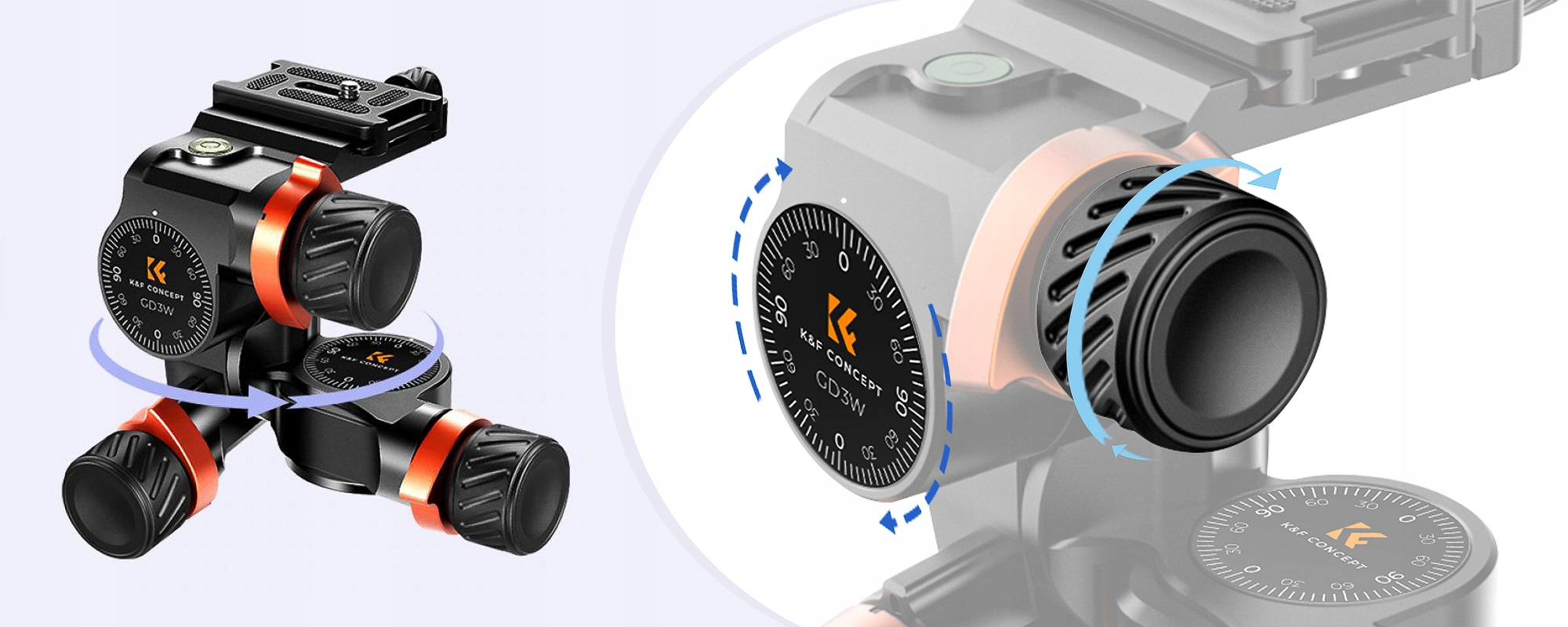 Голова K&F Concept GD3W — идеальный выбор для людей, которым важно очень точное кадрирование. Отдельные ручки для каждой оси позволяют быстро установить положение камеры. Микрометрические ручки также позволяют выполнять очень тонкую настройку, что неоценимо при макросъемке и фотосъемке продуктов. Это уникальное устройство позволит вам точно определить пространство кадра без риска сдвинуть что-либо при отпускании ручки, что часто случается со стандартными шаровыми головками.