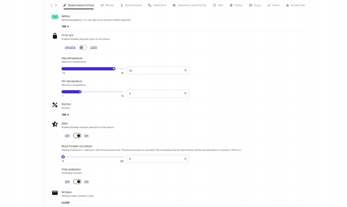 - Детектор открытого окна - автоматическое закрытие клапана в случае резкого падения температуры.