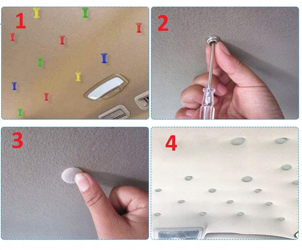 Содержит 100 серых ремонтных заклепок, 100 цветных булавок, 1 отвертку и 1 сантиметр. Ремонт не требует много времени и профессиональных инструментов. Идеальное решение для любого автомобиля, которому требуется ремонт потолка