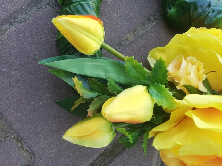 Цветочная композиция на могилу тщательно изготовлена, с соблюдением модных расцветок и очень качественных материалов и искусственных цветов.
