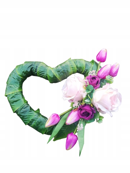 Цветы и материалы, использованные для составления композиции: Соломенный венок в форме сердца, покрытый листьями с цветочным декором