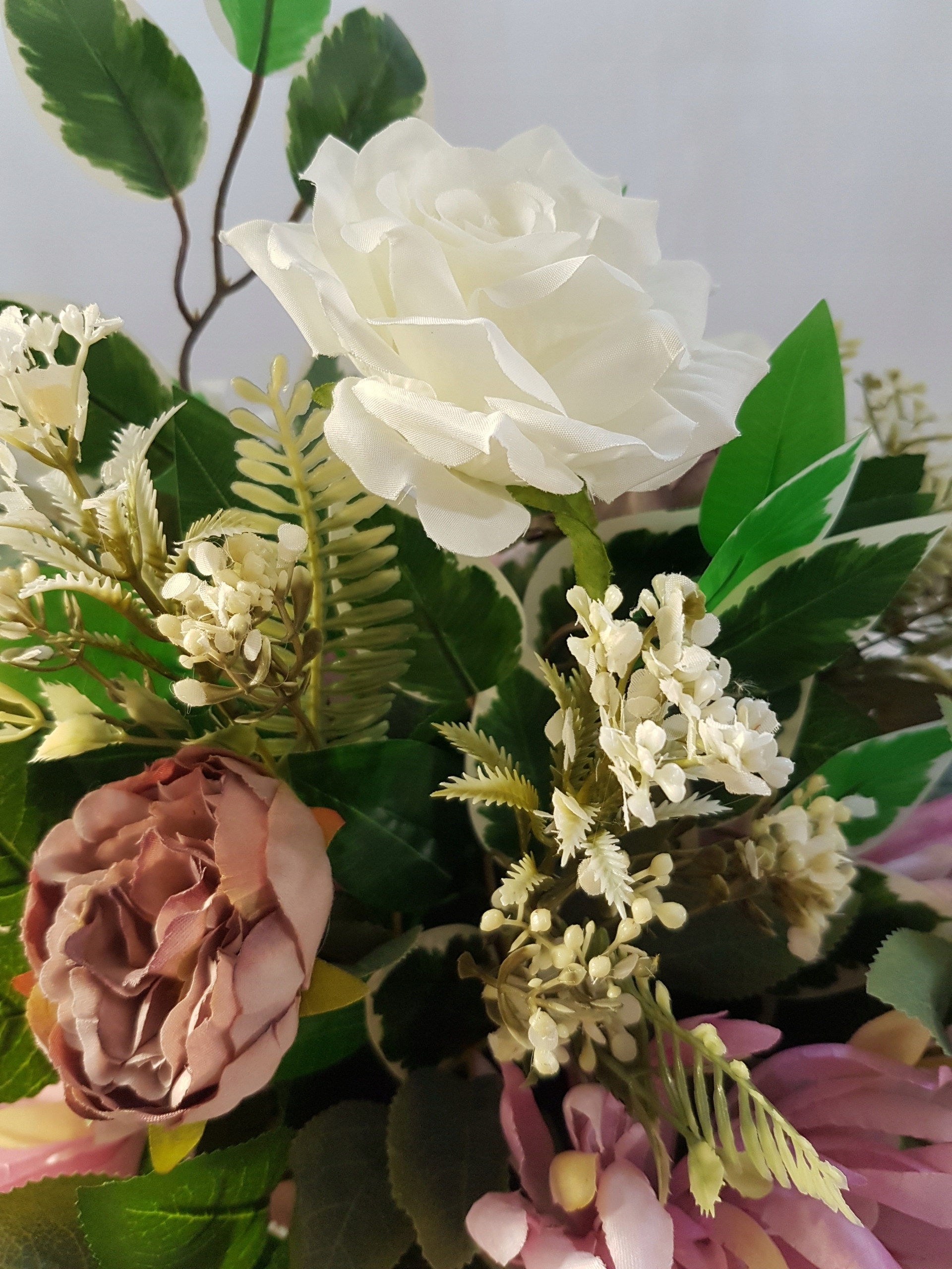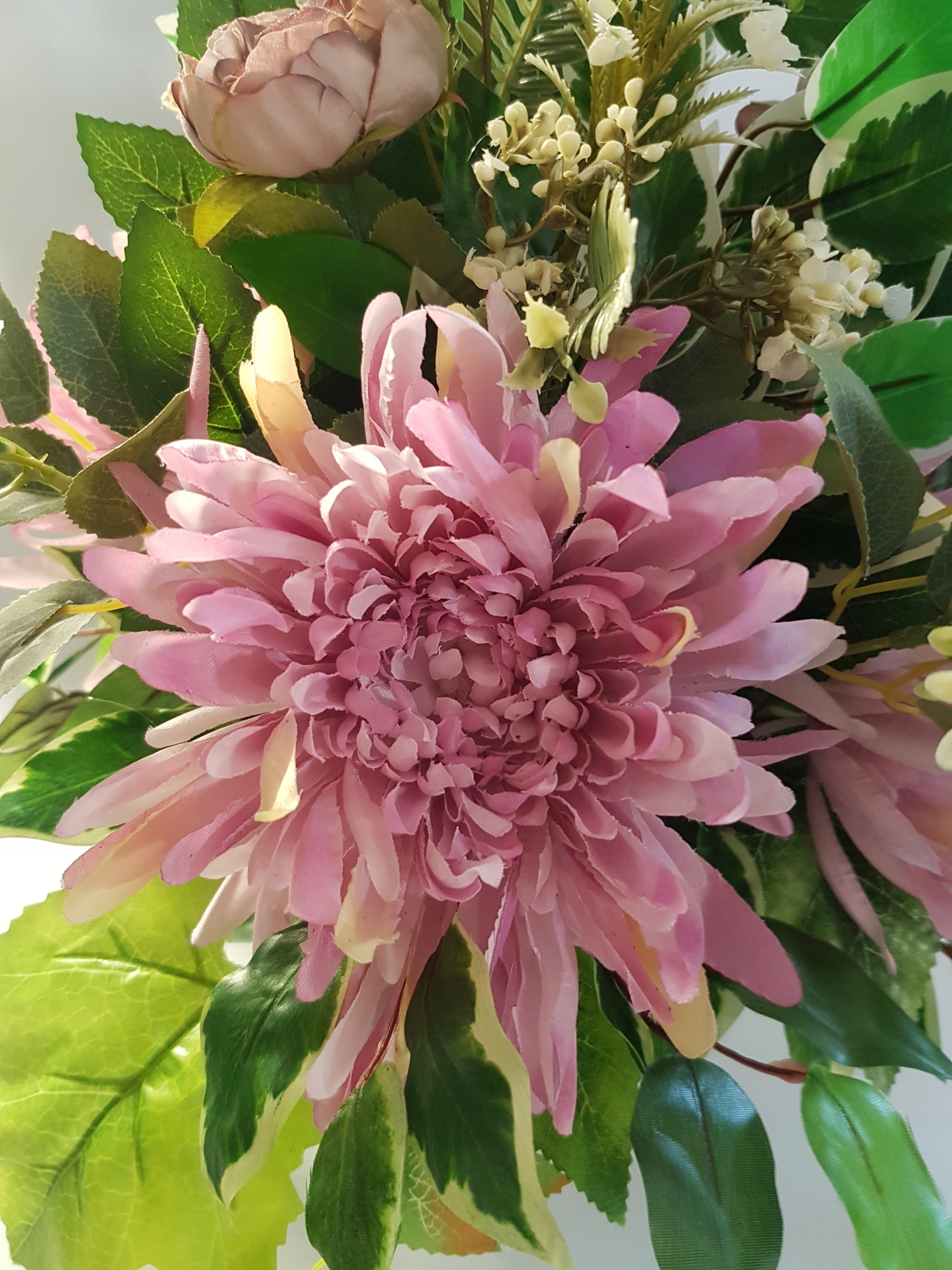 - Все выполнено из качественных искусственных цветов из ткани - роза, хризантема,