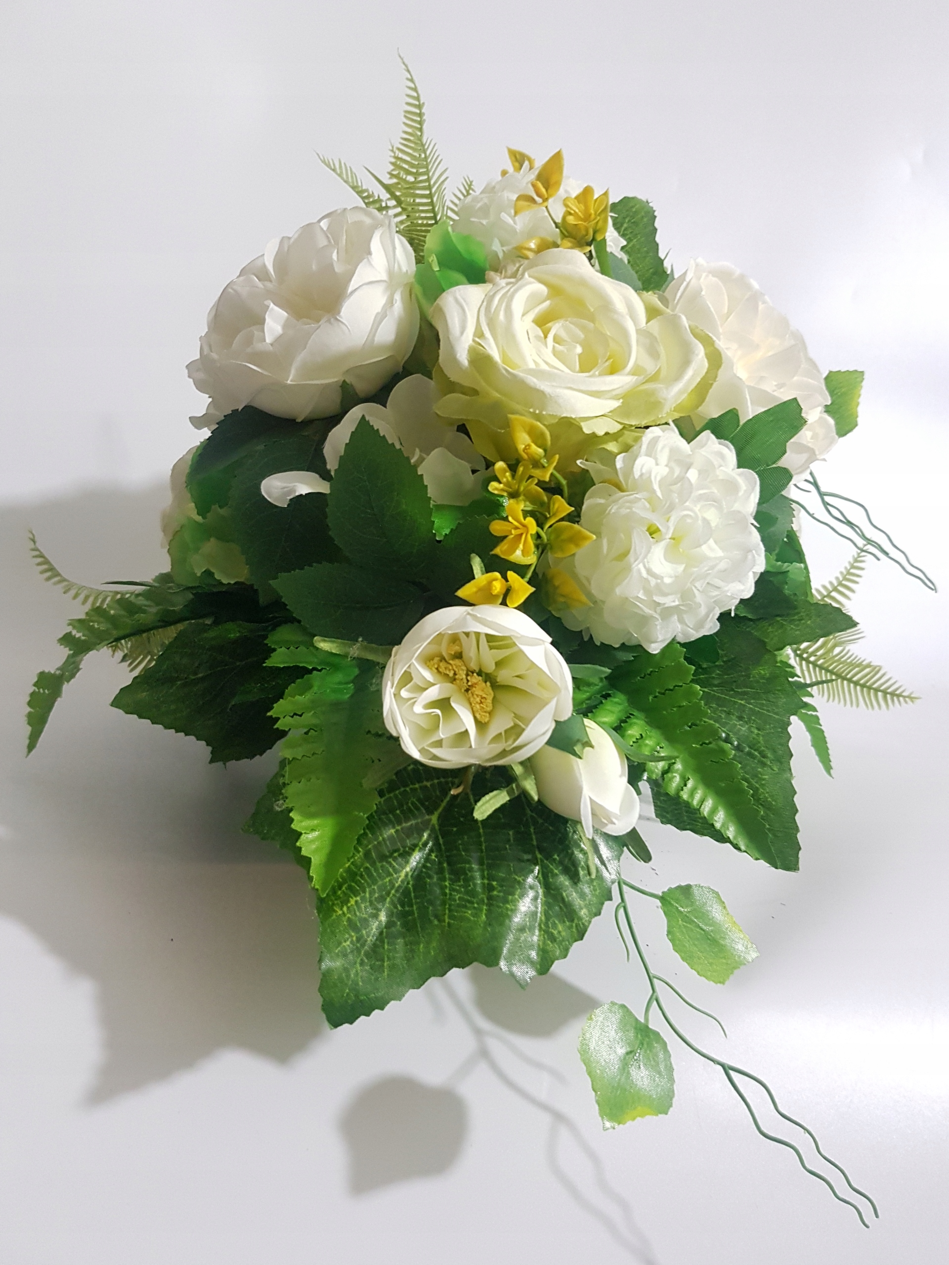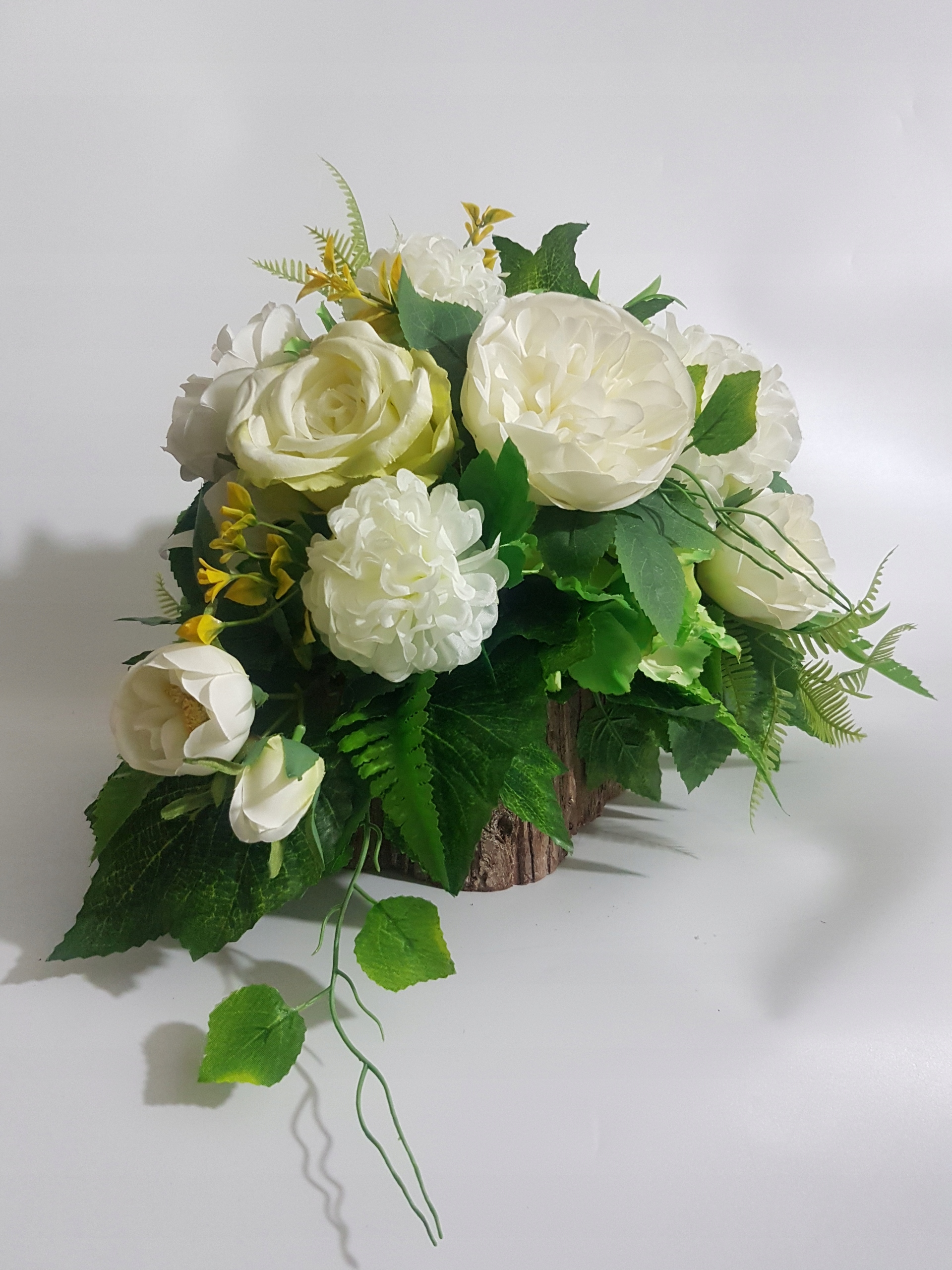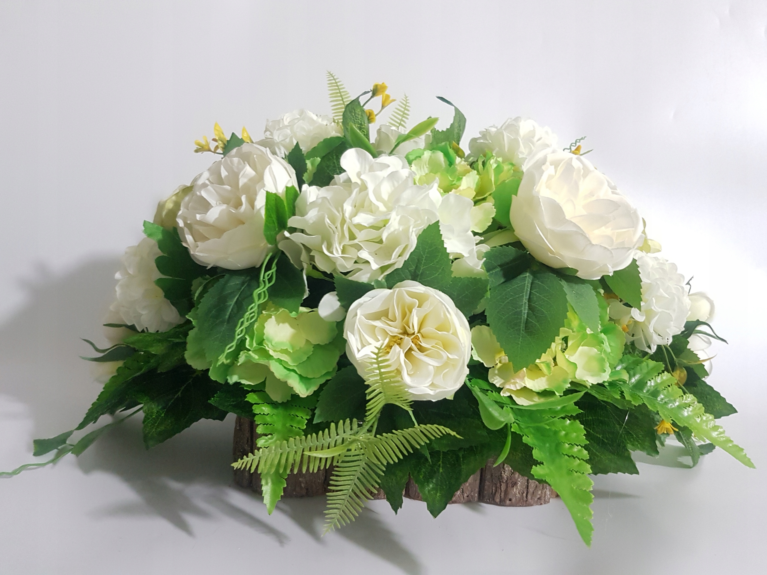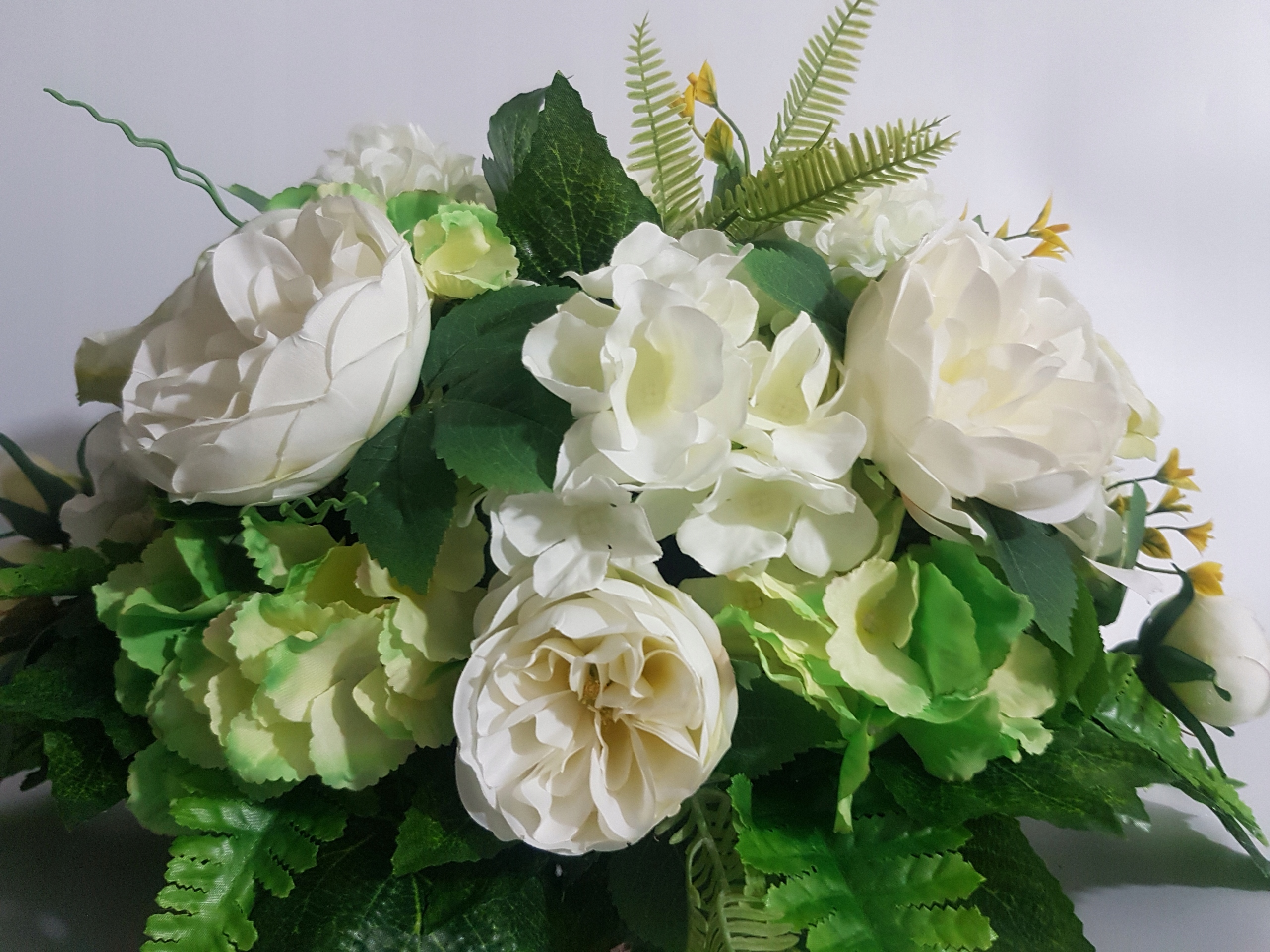 - >все выполнено из искусственных цветов хорошего качества из ткани - пионы, различные виды листьев, декоративные веточки, розы, гортензии,