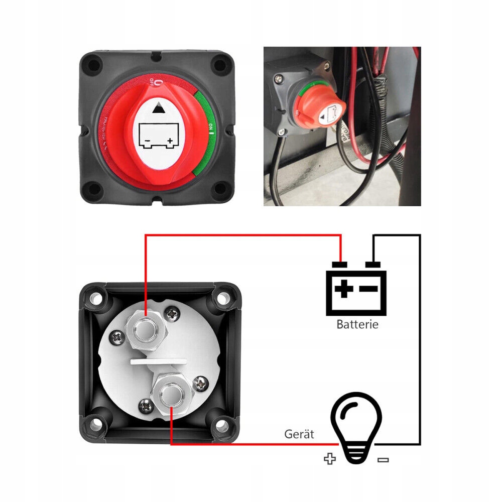 Выключатель безопасно отключает аккумулятор, чтобы исключить потребление энергии аккумулятором, когда транспортное средство или лодка не используется.
