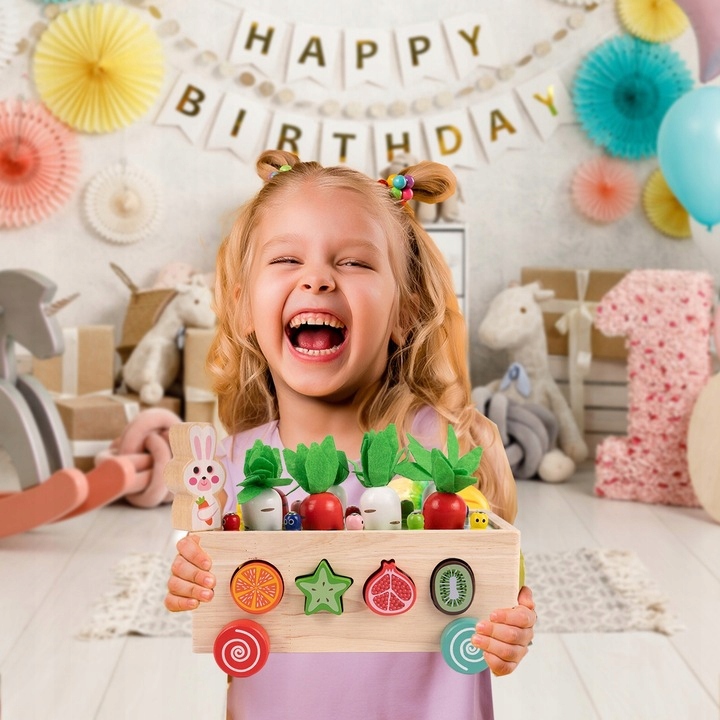 - ✅ Полный комплект - набор содержит 12 красочных фруктовых блоков, 8 очаровательных моркостей, 10 веселых работников и многофункциональная коляска для колес.