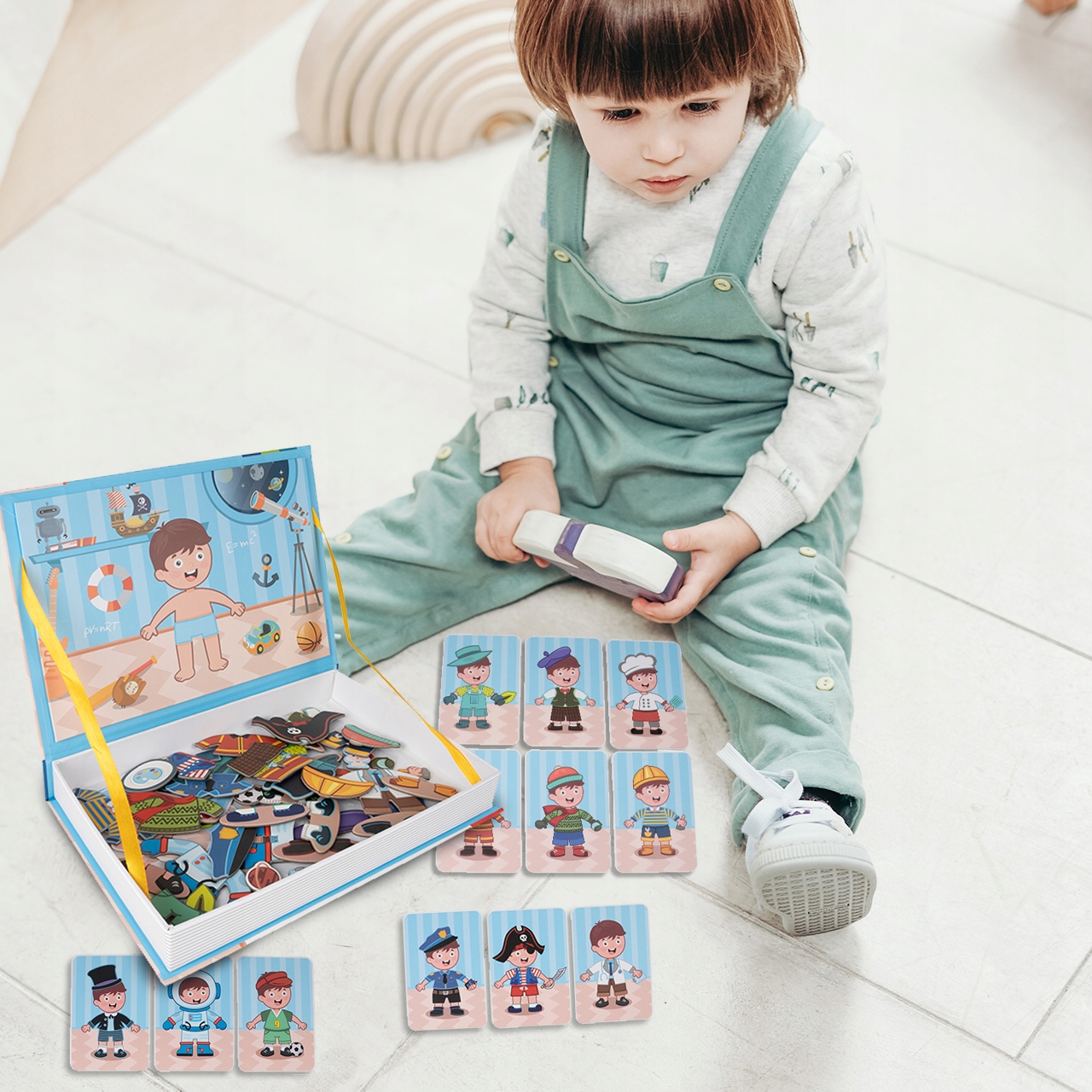Игрушка позволяет создавать 12 готовых стилей или комбинировать одежду, обувь и аксессуары для создания своих индивидуальных нарядов. Играя с магнитным нарядом, дети могут тренировать мелкую моторику и зрительно-моторную координацию.