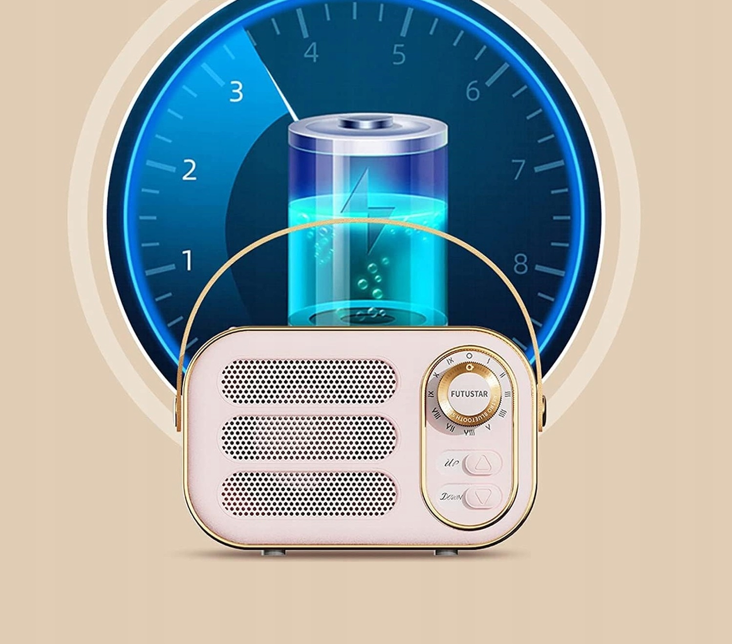 Отличная колонка для дома. Элегантный корпус с кожаной ручкой и стильной передней панелью дополняется позолоченными, слегка закругленными краями и большим, характерная ручка с циферблатом в стиле ретро, отвечающая за уровень громкости. Оборудование имеет мощность 5 Вт, а встроенный аккумулятор позволяет ему работать непрерывно до нескольких часов. Bluetooth имеет радиус действия до 10 метров, поэтому вы можете слушать музыку на большем расстоянии, не беспокоясь о том, что соединение с динамиком будет нарушено. потеряться.