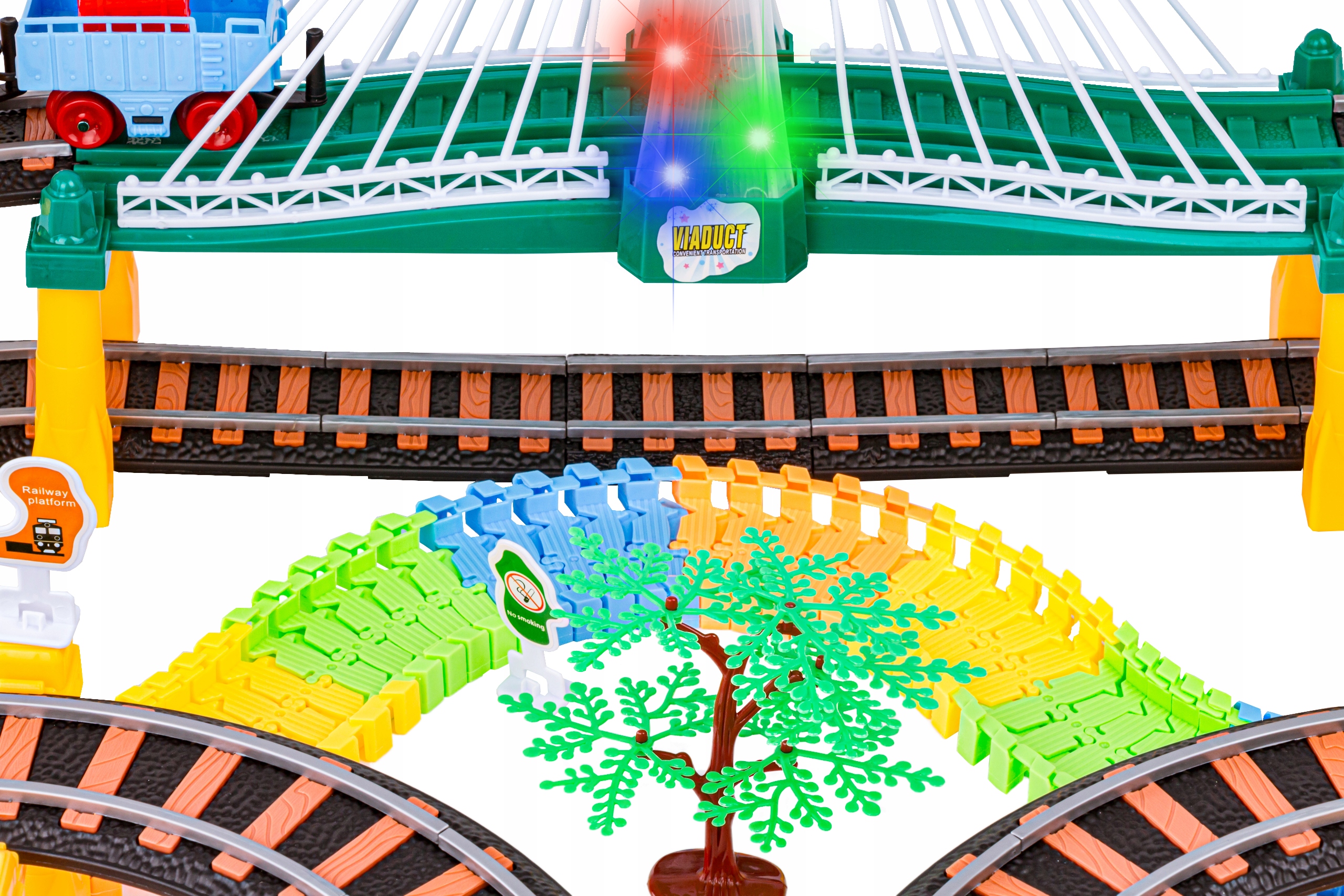 У локомотива и вагона отдельные пути. Набор дополнен световыми и звуковыми эффектами. Проезжая мост, поезд активирует световые эффекты – мы видим весело мигающие разноцветные огни. Локомотив во время движения издает звуки настоящего паровоза :)