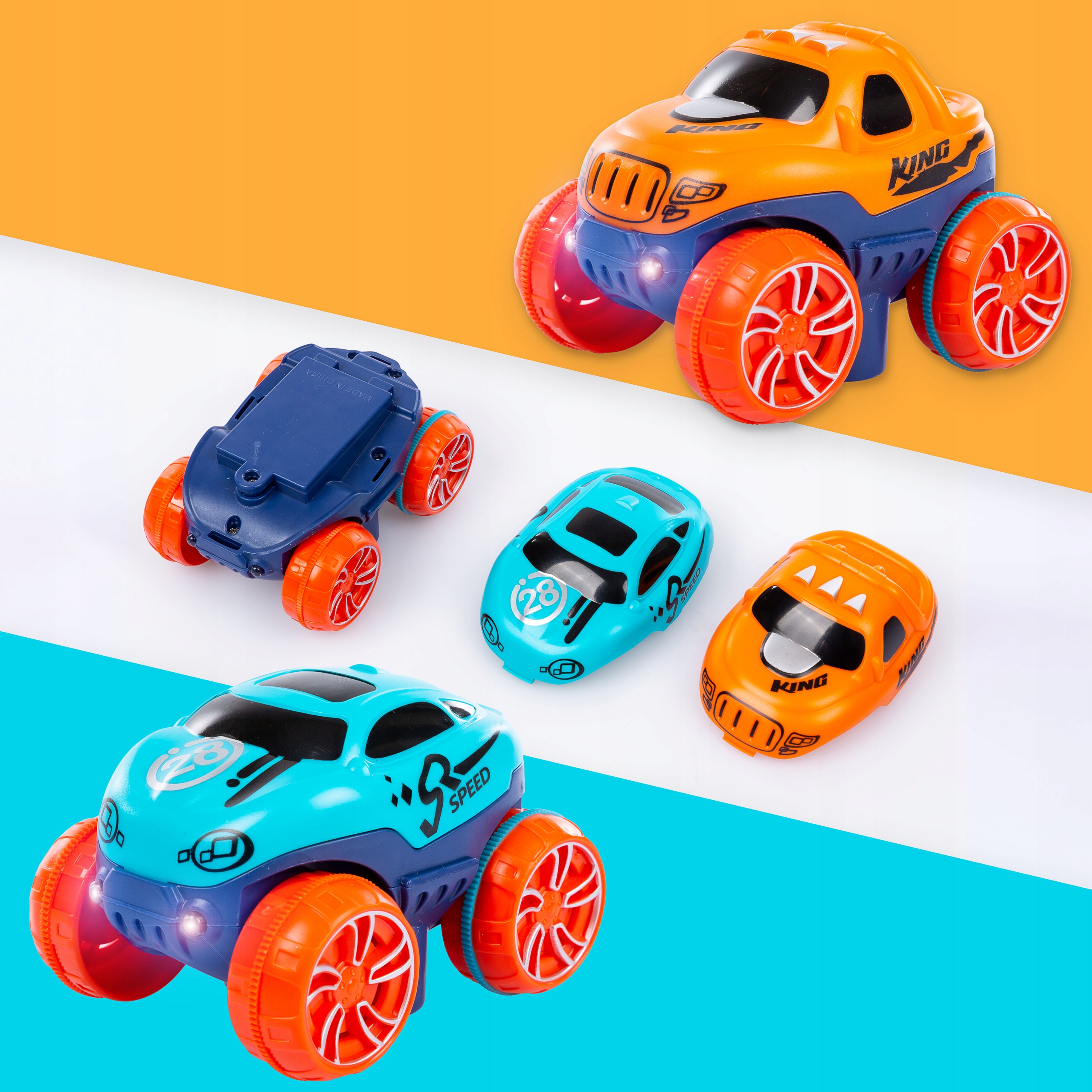 Машина с функцией смены кузова на оранжевый или синий цвет. Благодаря подсвеченным передним фонарям веселье будет еще лучше, когда свет выключен.