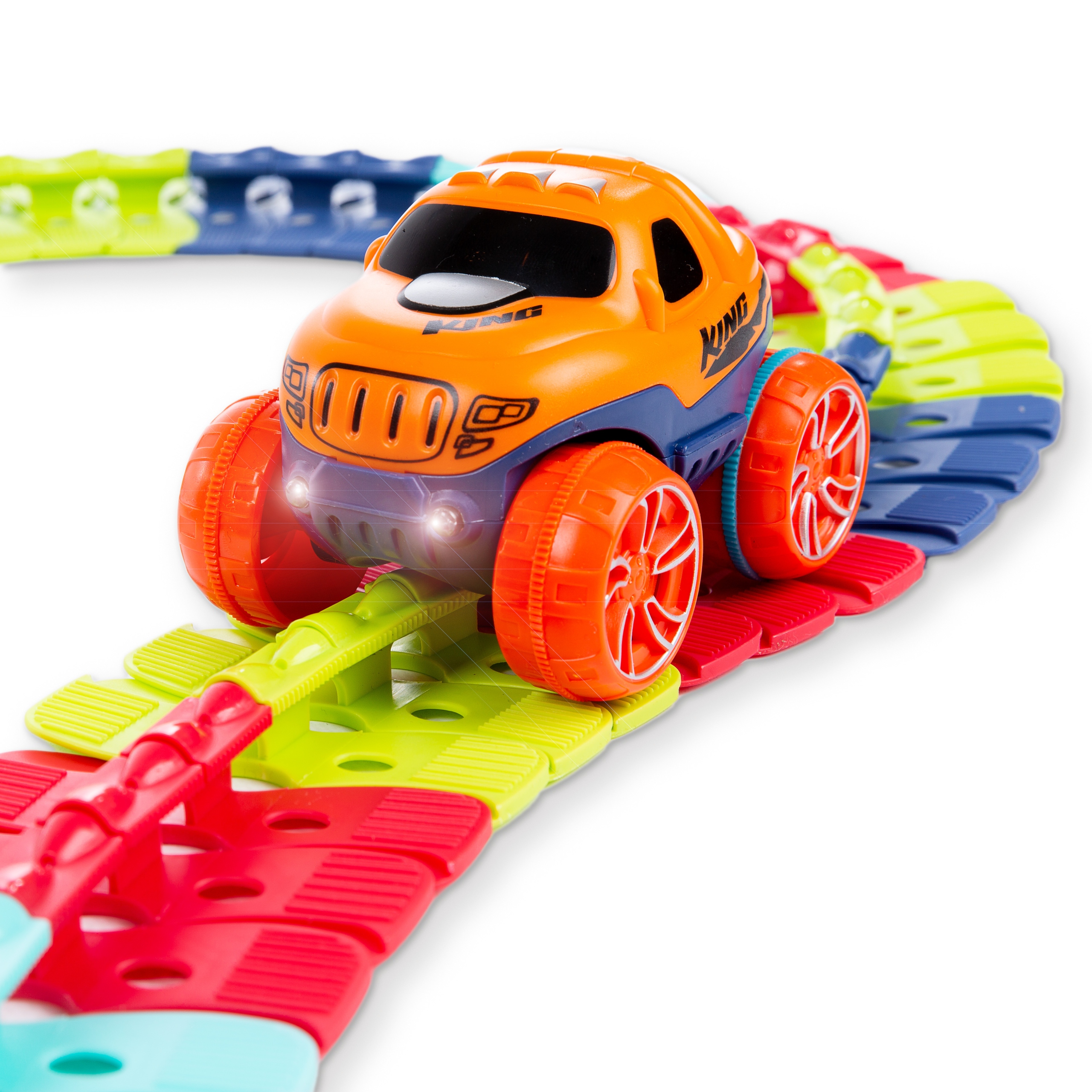 Благодаря гибкой гусенице у вас есть безграничные возможности для создания извилистых и захватывающих треков! Она состоит из 138 красочных элементов дороги, которые можно легко компоновать и изменять по своему усмотрению. Дорожка гибкая и проста в сборке, а машина оснащена светодиодами, светящимися в темноте. Набор обеспечивает развлечение как в одиночку, так и в компании. Создание дорожки зависит только от вашей фантазии!