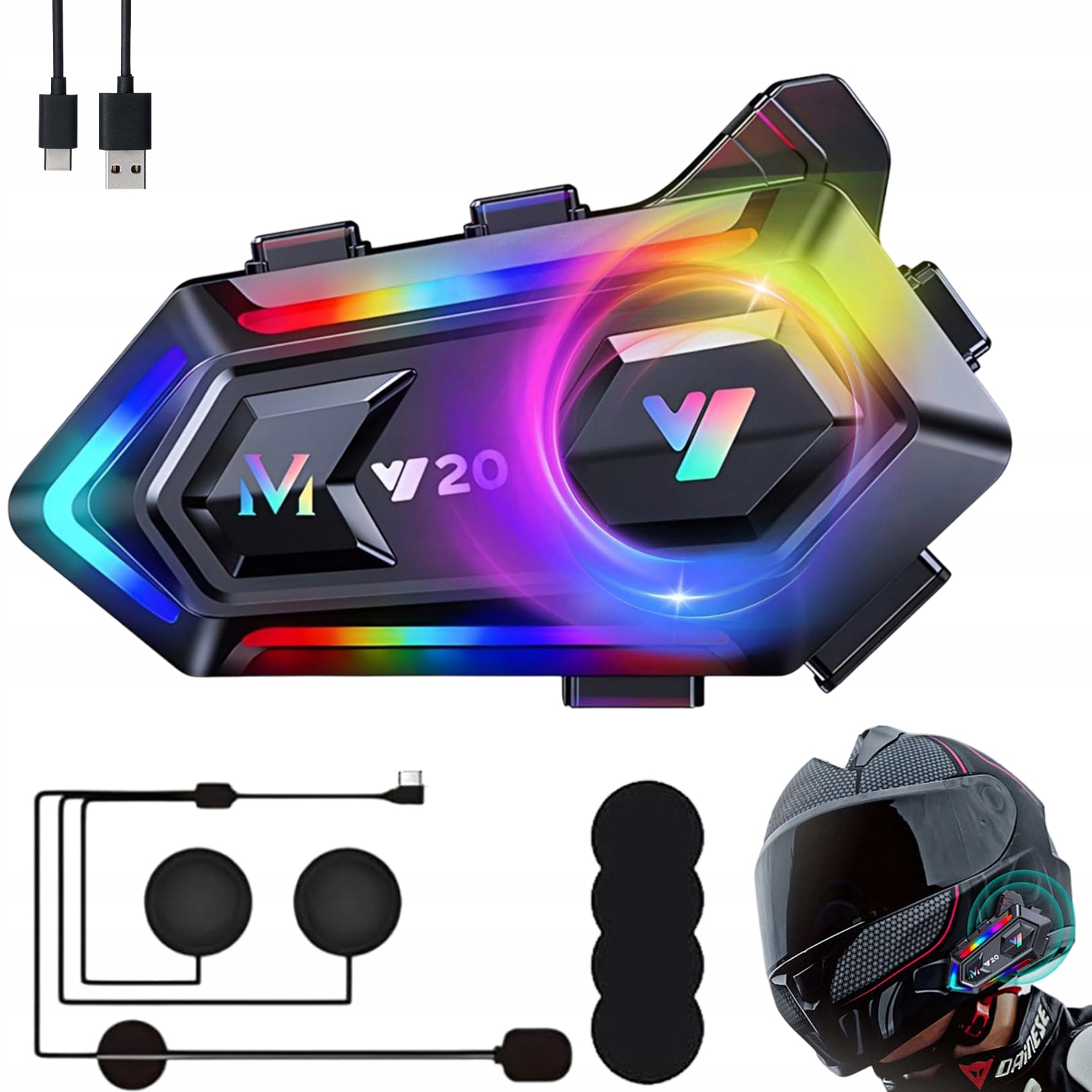 Гарнитура Bluetooth 5.3 для мотоциклетного шлема Y20 (встроенный аккумулятор емкостью 1000 мАч, в комплект входит знак 2 в 1 + защелкивающаяся база + установочный пакет на липучке + кабель для зарядки типа C + руководство на английском языке р>