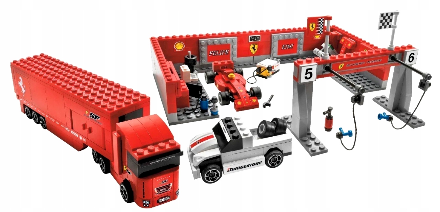 lego racers ferrari f1 pit 8155 - чрезвычайно подробный набор, который приведет вас в мир гонок Формулы 1. Выпущенный в 2008 году в рамках серии Lego Racers , представляет собой знаменитый Ferrari F1 Brolid и реалистичный Pit Stop -Ploce - с механиками, инструментами и всем фон, необходимым во время гонки. Набор, который вы найдете Ferrari Racing Car , технические стенды, фигурки механики и множество аксессуаров, которые позволяют вам восстановить реальную атмосферу гоночной дорожки. Это отличное предложение не только для детей, но и для взрослых фанатов и коллекционеров сетов Lego Ferrari.