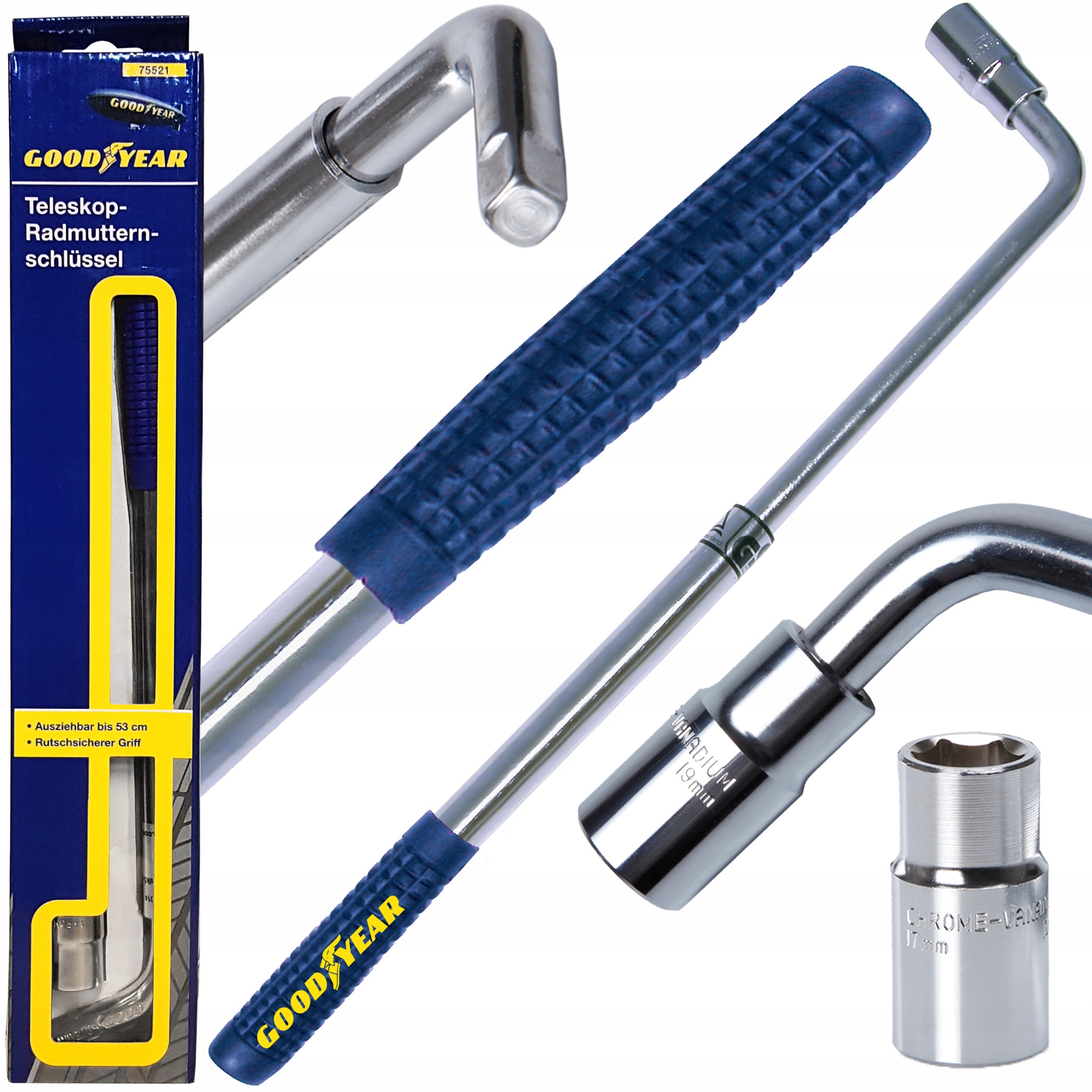 Профессиональный телескопический колесный ключ Goodyear. Его длина регулируется от 22 см до 41 см, что облегчает транспортировку и хранение и в то же время позволяет применить соответствующее усилие для откручивания или затягивания винтов. Он идеально подходит для замены колес и ремонта, в том числе: автомобилей. Ключ изготовлен из высококачественной стали. Нескользящая резиновая ручка защищает руки от мозолей и позволяет надежно удерживать их во время работы. В комплект входит двусторонняя головка размером 17/19 мм 1/2". Удобна в использовании, идеальна для любого автомобиля и для мелких ремонтных работ. Бренд Goodyear – это качество, в котором можно быть уверенным. Строгий контроль качества продукции гарантирует безопасность при использовании.