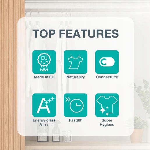 Некоторые модели сушильных машин имеют уникальную функцию SuperHygiene, которая работает во время программы ExtraHygiene и удаляет бактерии и плесень из белья с помощью высоких температур сушки и специальной внутренней технологии. Одежда будет идеально чистой, и при этом ваша сушилка дольше останется свежей, без бактериальных отложений и связанных с ними неприятных запахов.