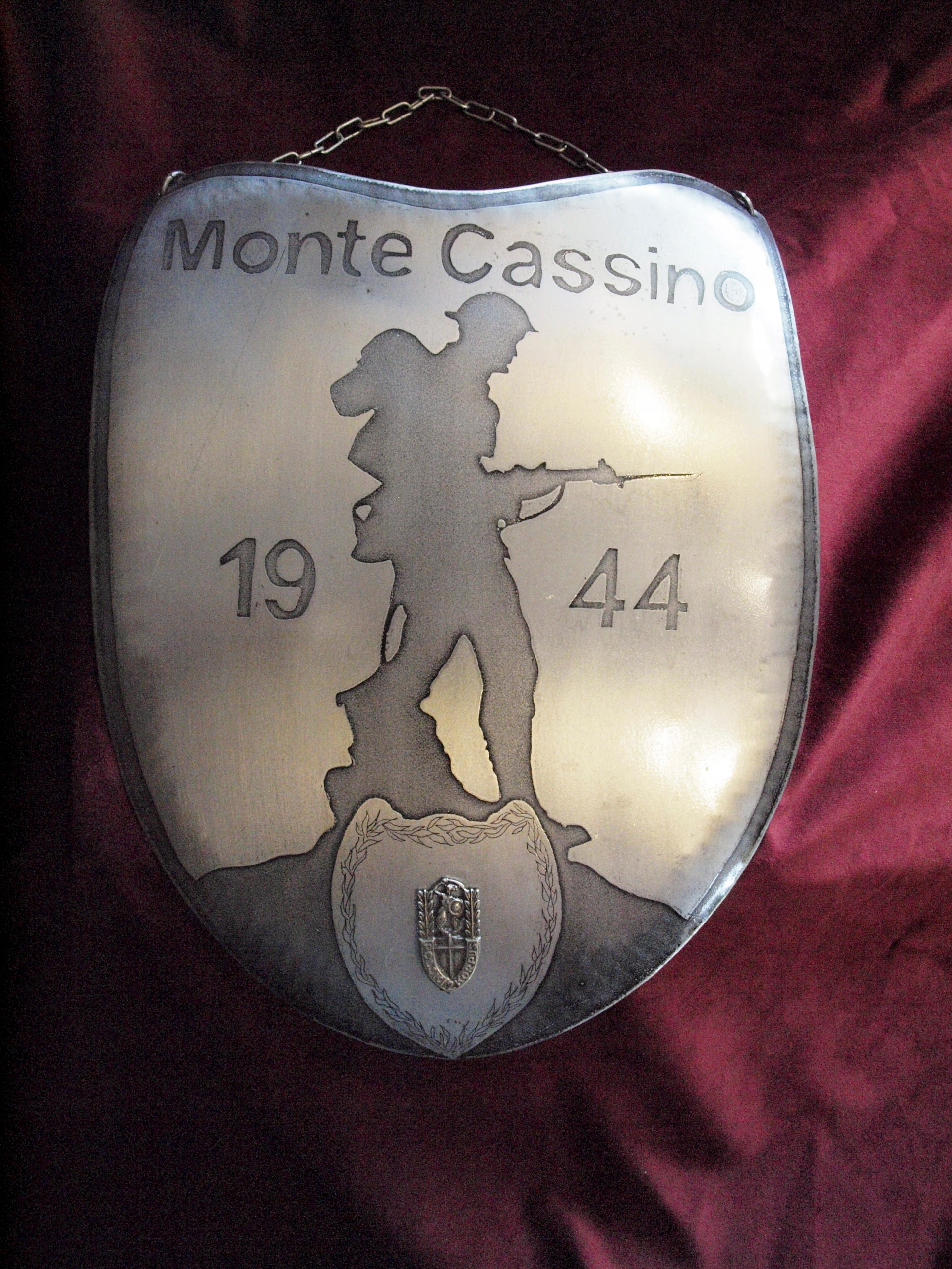 Стальной нагрудник, репуссе, травление, оксидирование серо-стального цвета. В центре фигура польского солдата 2-го корпуса, над надписью Monte Cassino, по бокам дата - 1944 год.