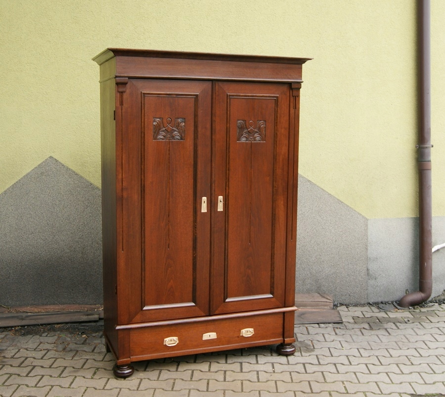 Предмет сегодняшнего аукциона — шкаф-купе межвоенного периода, выполненный из дерева с натуральной шпоной ореха, свежеотреставрированный, с полуматовый финиш. Товар свежий и чистый. Замки в рабочем состоянии, оригинальные таблички,