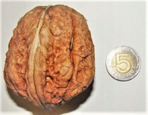 Разнообразие не требует резки, обрезки. Плодородные, растет в каждой почве, устойчиво к вредителям. Это орехи среднего размера, с яйцевидной формой и мясистым темно -зеленым покровом. Их довольно тонкие раковины имеют светло -коричневый цвет и плохо отмеченные борозды. Ядра, покрытые красными покрытиями, составляют почти половину массы фруктов. Они большие и вкусные, поэтому они подходят как для прямого потребления, так и для обработки