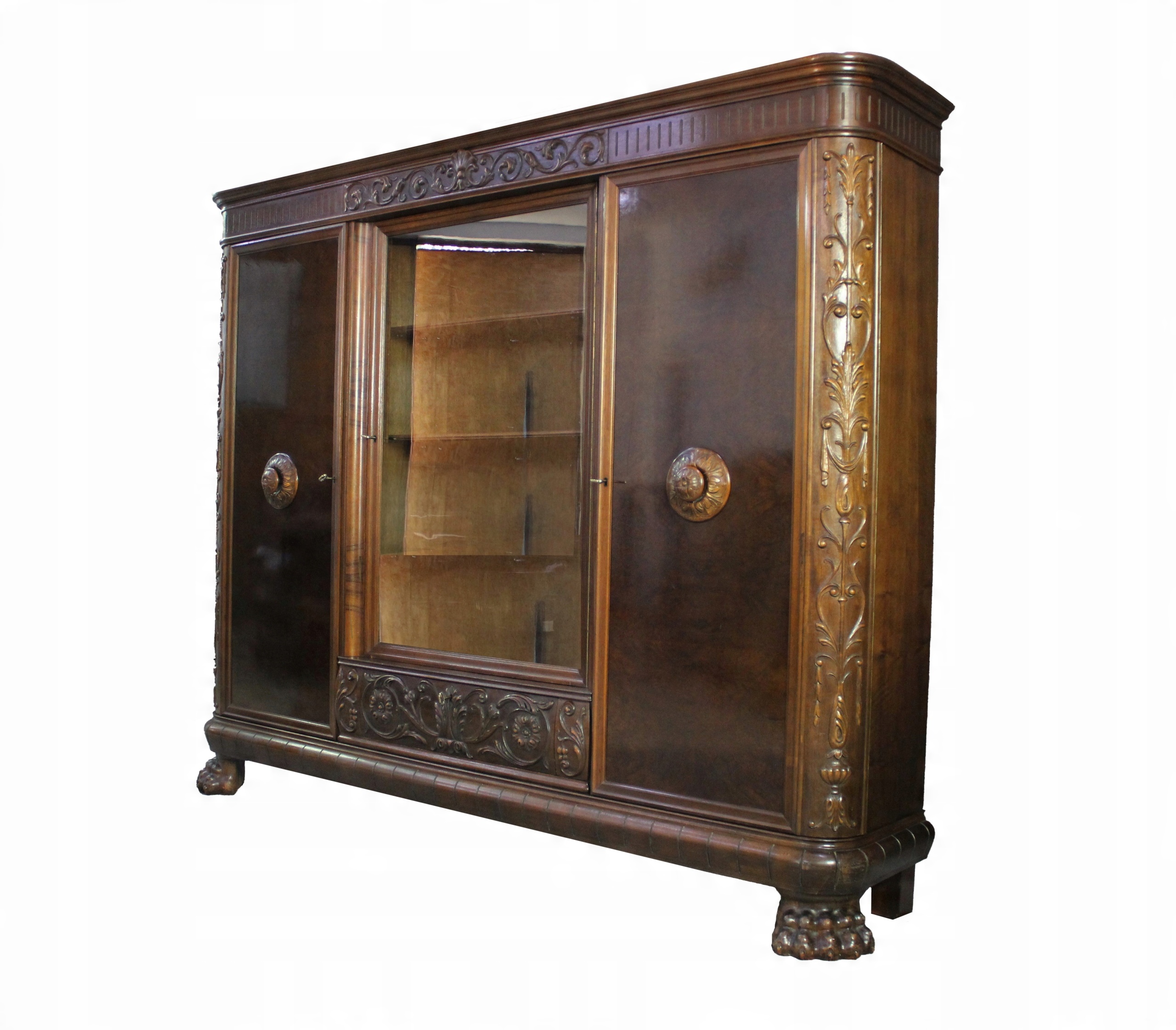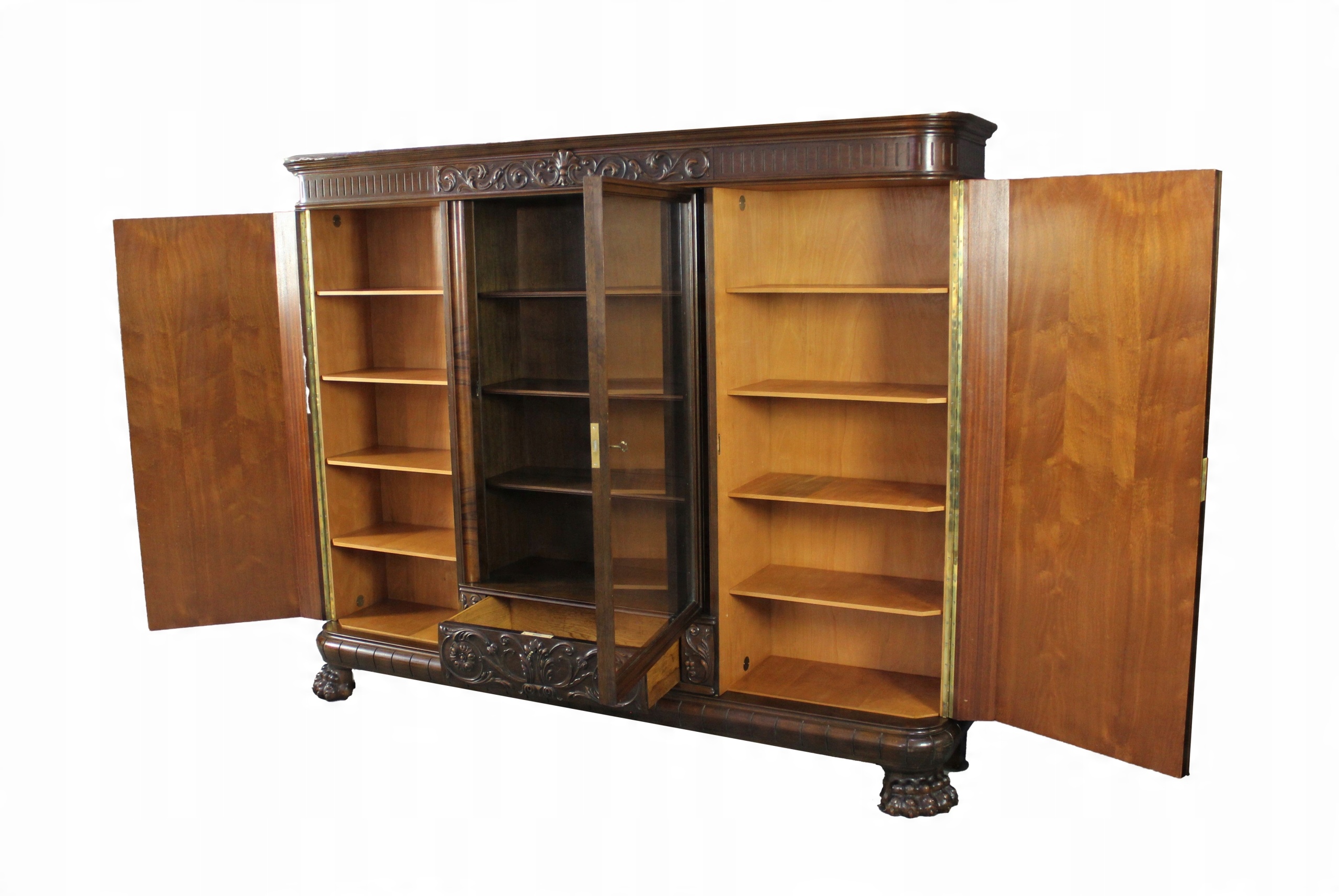 Библиотека на львиных лапах. Предмет мебели уникальной массивной формы, характерной для стиля неоренессанс. В нем был проведен консервативный ремонт, оставив оригинальное чистовое покрытие. Все очень хорошо подогнано, продезинфицировано, нет неприятных запахов и насекомых. Замки функциональные, к каждому есть ключ. Мебель имеет обычные признаки использования. Состояние очень хорошее, готово к размещению.
