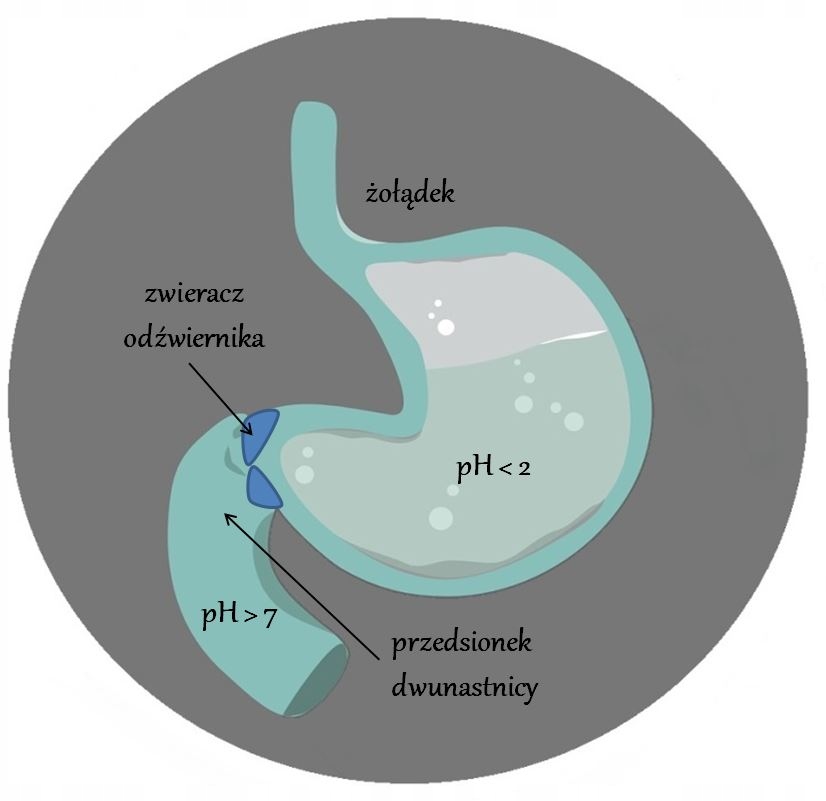 При нормальном состоянии пищеварительной системы кислотность в желудке ниже 2 pH. В процессе пищеварения пищевая пульпа меняет свой pH на более щелочной (pH 7). Желудок отделен от преддверия двенадцатиперстной кишки пилорическим сфинктером. Он активируется и вводит порции жидкого содержимого в преддверие двенадцатиперстной кишки, в котором щелочная среда имеет pH выше 7. Затем пилорический сфинктер должен закрыться, чтобы отделить желудок от двенадцатиперстной кишки, чтобы поддерживать кислотность желудка ниже 2. Если это работает для вас, вы здоровы.