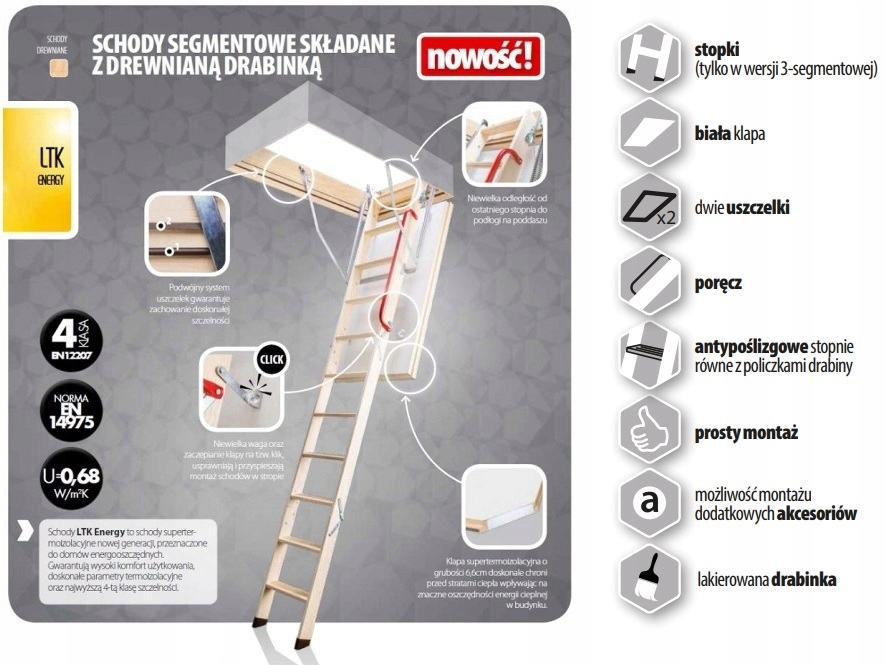 Лестницы LTK Energy – супертеплоизоляционные лестницы нового поколения, предназначенные для энергосберегающие дома. Они гарантируют высокий комфорт использования, отличные параметры теплоизоляции и высший 4-й класс герметичности по стандарту EN14975.