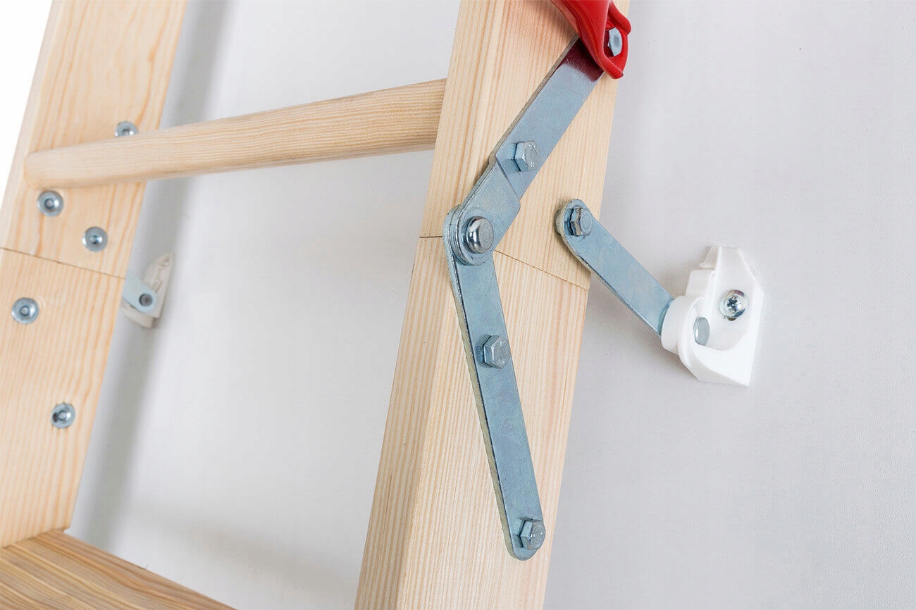 Кроме того, механизм поддерживает створку в полностью открытом положении, не допуская ее автоматического закрытия при раскладывании и складывании лестницы.