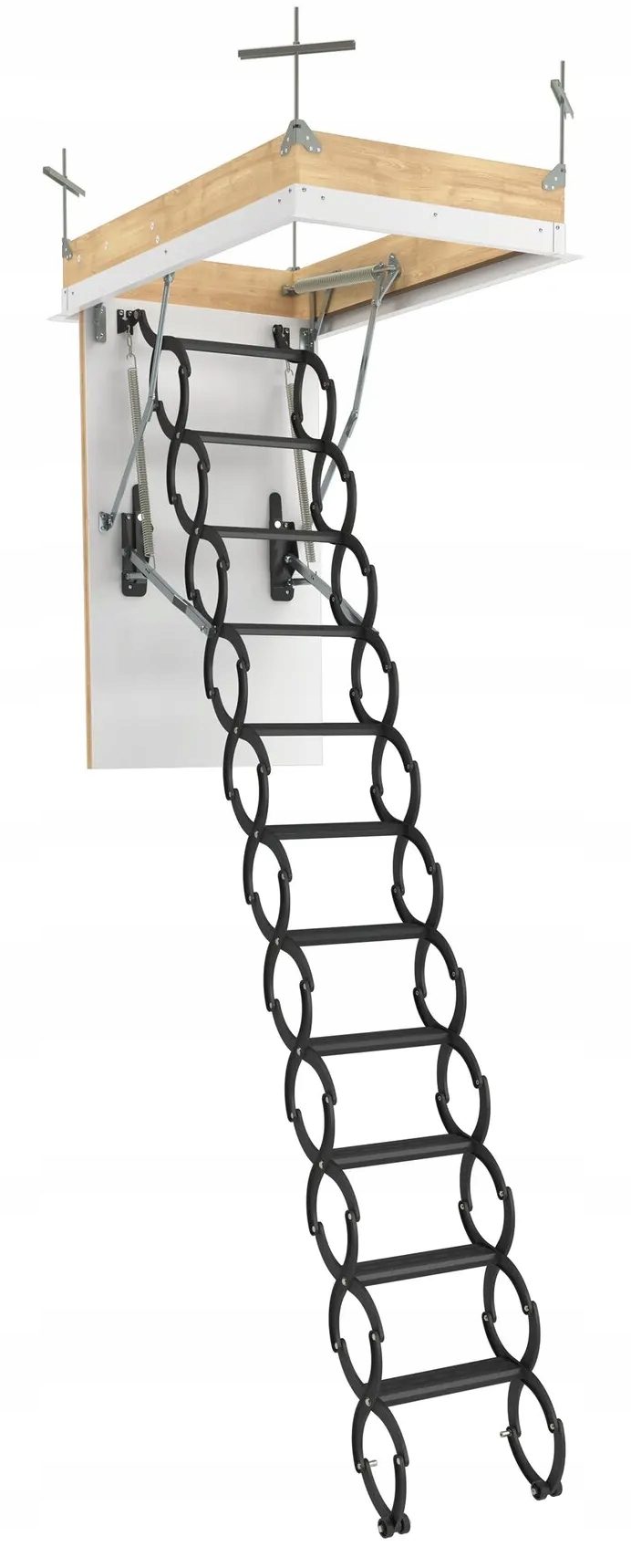 - Фурнитура:Пружинная защелка придает жесткость коробке и предотвращает изменение диагоналей коробки. Благодаря тому, что коробка не деформируется, лестницей можно без проблем пользоваться долгие годы. Особая конструкция петель повышает жесткость подвижных элементов.