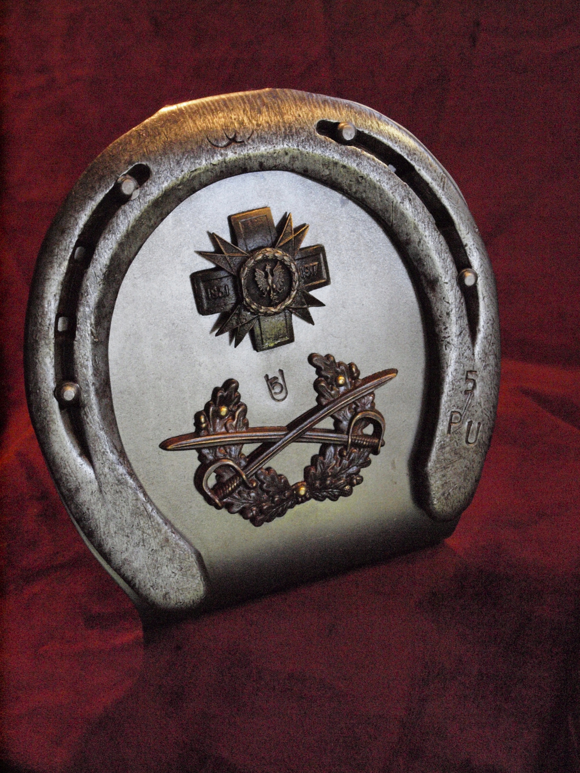 Основной элемент - оригинальная подписанная кавалерийская подкова 1920-1930-х годов (бывшая в употреблении, верховая подкова) - подпись "две скрещенные подковы" и 5.П.У.