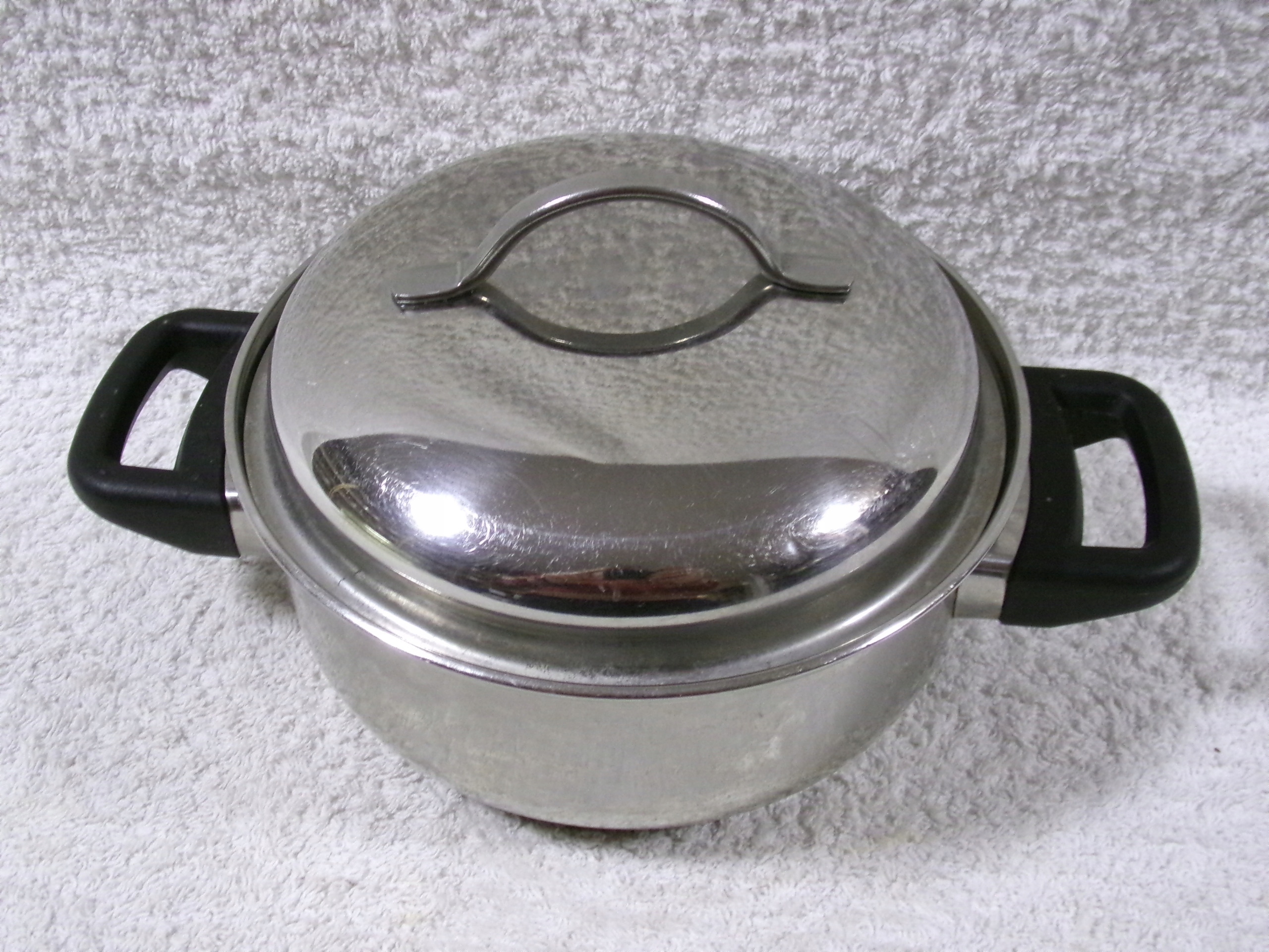 Твердая кастрюля из нержавеющей стали с центральным диаметром 17 см, высотой 7,5 см, вместимостью примерно 1-1,5 литра, весом 0,51 кг. Очень хорошее состояние, без повреждений, незначительные следы использования.