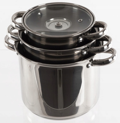 - Кастрюли со стеклянными крышками и ручками из нержавеющей стали по бокам.