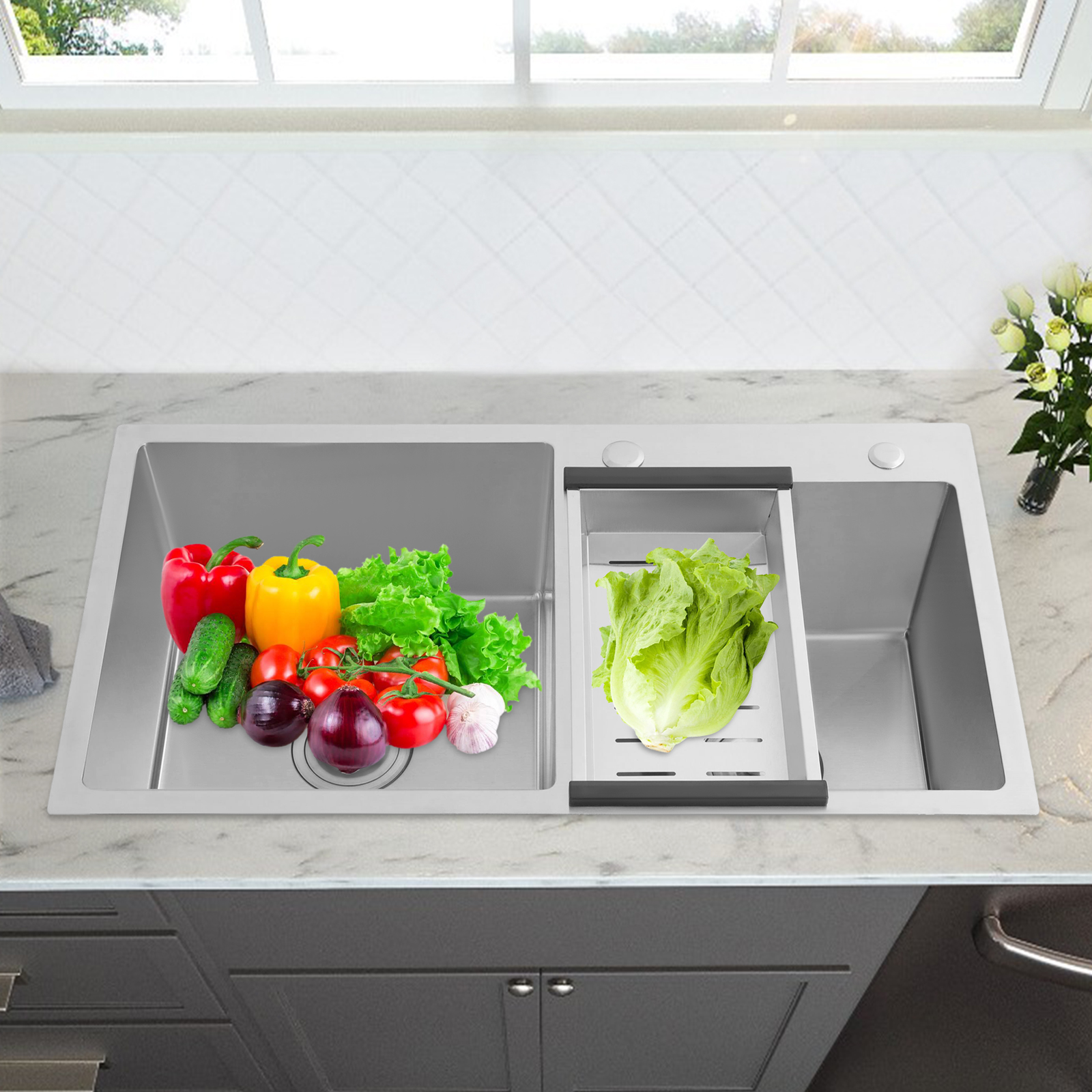 Большая вместимость: две камеры размером 14,72 x Размеры 14,96 дюйма и 12,99 x 12,99 дюйма не только обеспечивают большое рабочее пространство для размещения большинства кухонных принадлежностей, но также позволяют мыть посуду и ингредиенты отдельно (все не входят в комплект), что значительно повышает эффективность вашей работы.