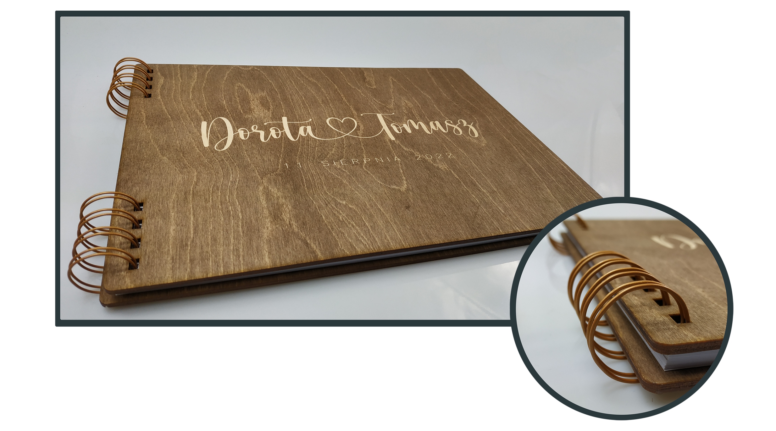 Обложки книги изготовлены из дерева, а их элегантный дизайн подойдет к любому интерьеру. Гравировка придает еще больше характера и делает книгу уникальной.