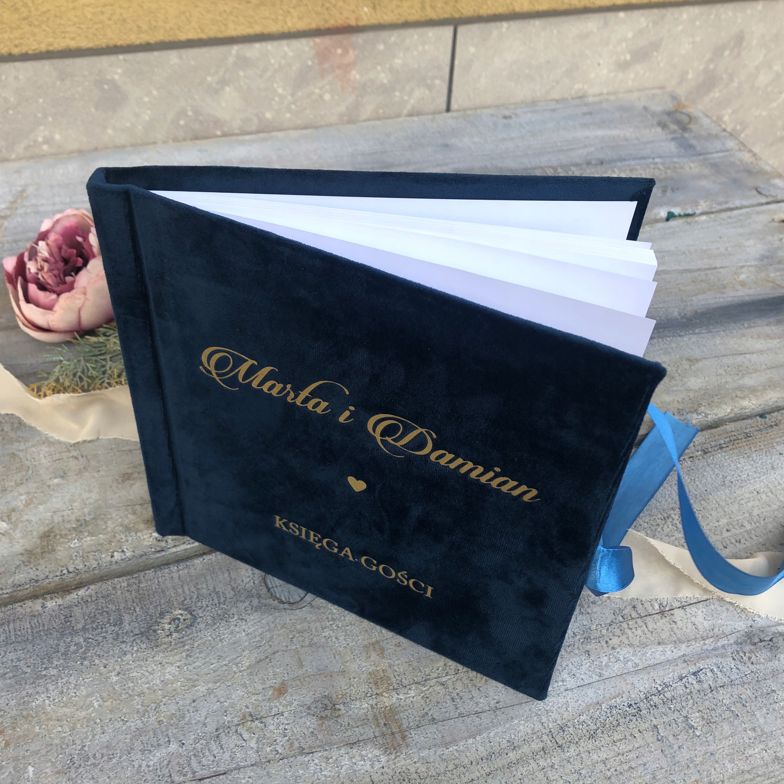 Темно-синий стал хитом свадьбы последних лет, поэтому у нас есть для Вас уникальное предложение. Велюр, именная обложка, позолоченные надписи, красивая лента и открытки ждут слова ваших гостей.