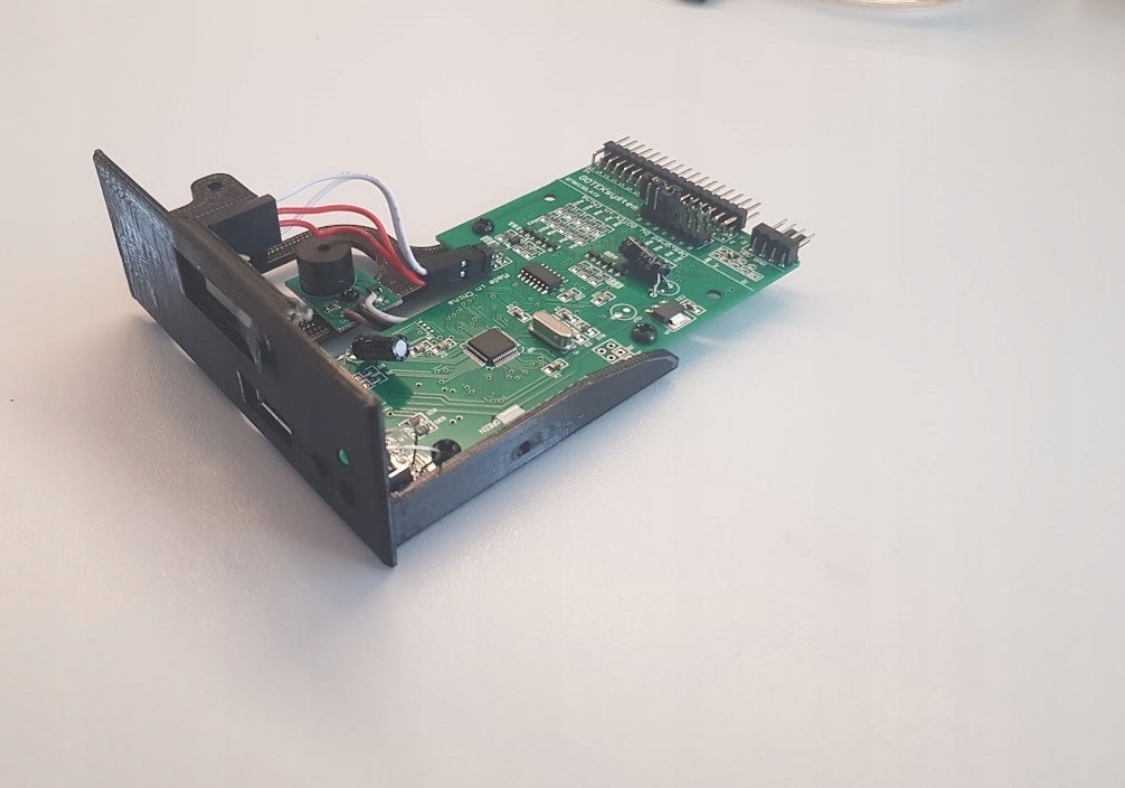 Эмулятор/дисковод гибких дисков Gotek с установленным программным обеспечением FashFloppy. С установленным oled дисплеем и активным динамиком, имитирующим работу станции во время чтения. Все это помещено в печатную рамку, подходящую для Amstrad CPC 6128.