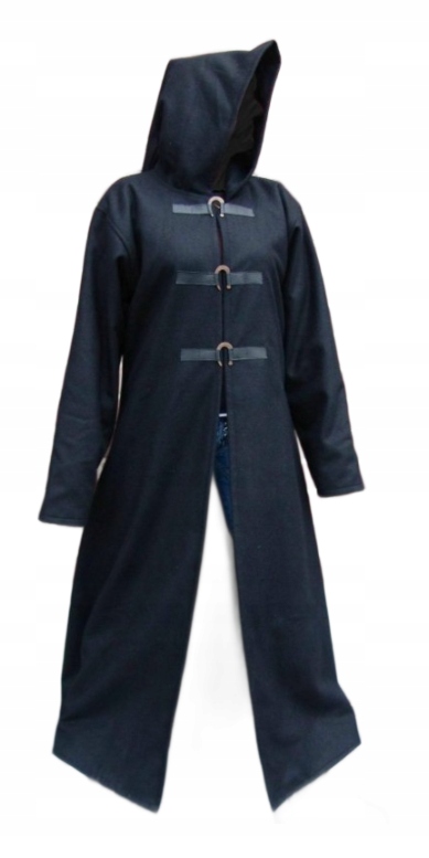 Длинное пальто с капюшоном на подкладке из плотной смесовой шерсти на хлопковой подкладке, застегивается на большие крючки спереди.
