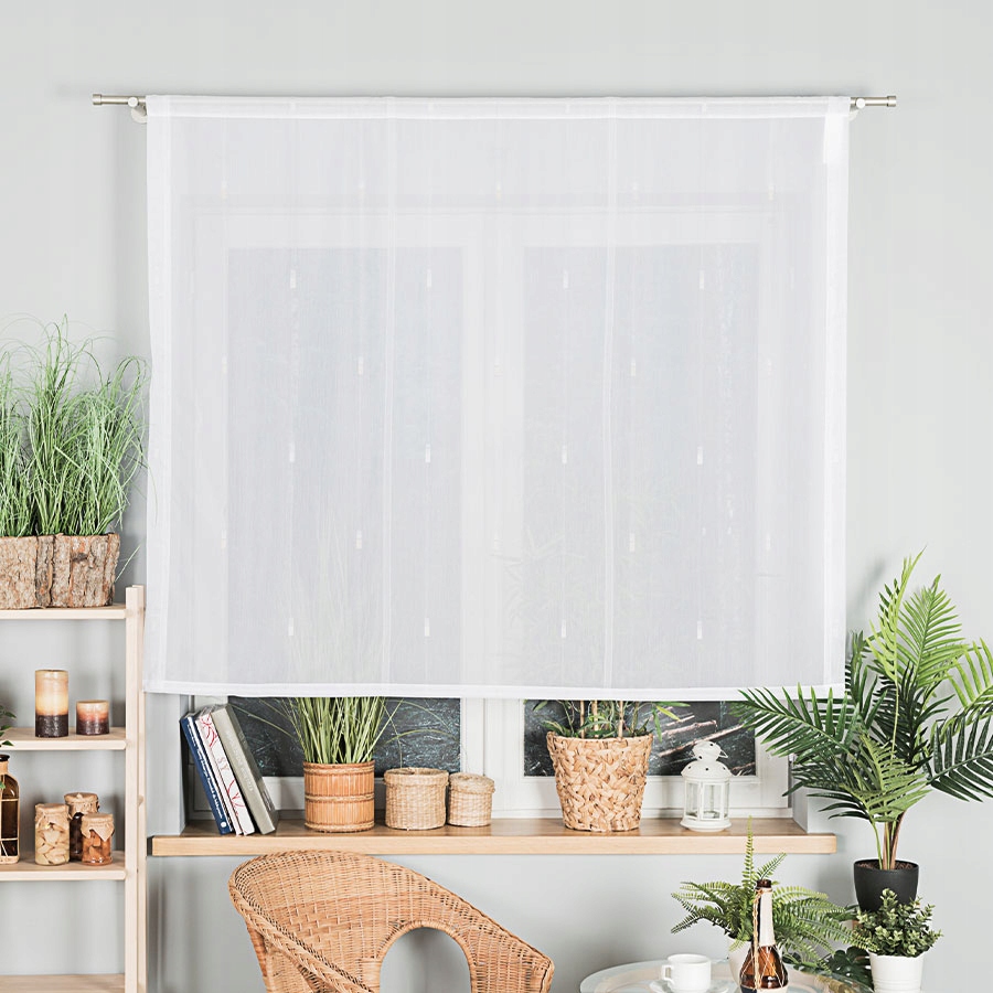 Римские шторы выполняют как декоративную, так и практическую функцию. Готовые римские шторыиз белой ткани, украшенной золотой нитью, которая будет красиво переливаться при искусственном или естественном освещении. Материал отличается высокой светопроницаемостью, поэтому не затемнит интерьер, а лишь мягко защитит помещение от внешнего света. Низ закончен туннелем внутри него находится пластиковый стержень, который утяжеляет рулонную штору и позволяет ей красиво расположиться. Сверху также имеется туннель, который позволяет подвешивать его на традиционном карнизе или на лягушках. Благодаря входящим в комплект булавкам можно регулировать ширину декоративных складок.
