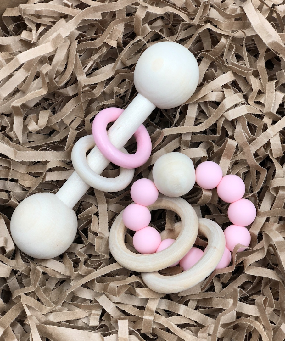 - сенсорный прорезыватель для прорезывания зубов, из безопасного для детей силикона и натурального дерева, в форме розовых шариков,