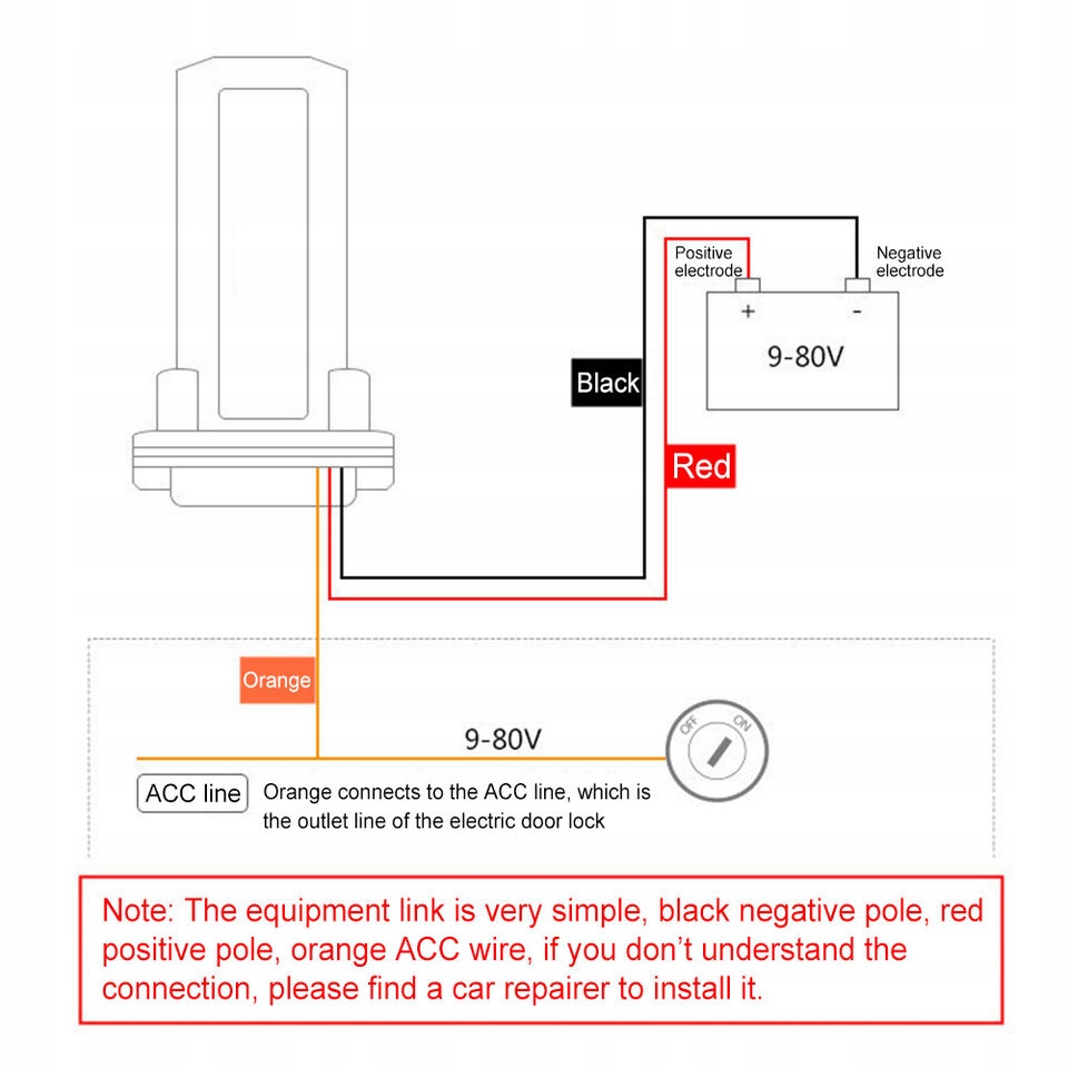 - После установки положения ОК подключите линию электропитания, красная линия подключается к положительный электрод, черная линия контактирует с отрицательным электродом, оранжевая линия - это линия ACC и подключите выход электрического замка, куда вставлен ключ, подключите линию. Когда ключ открыт, есть питание, и ключ выключен, питания нет. < /ul>