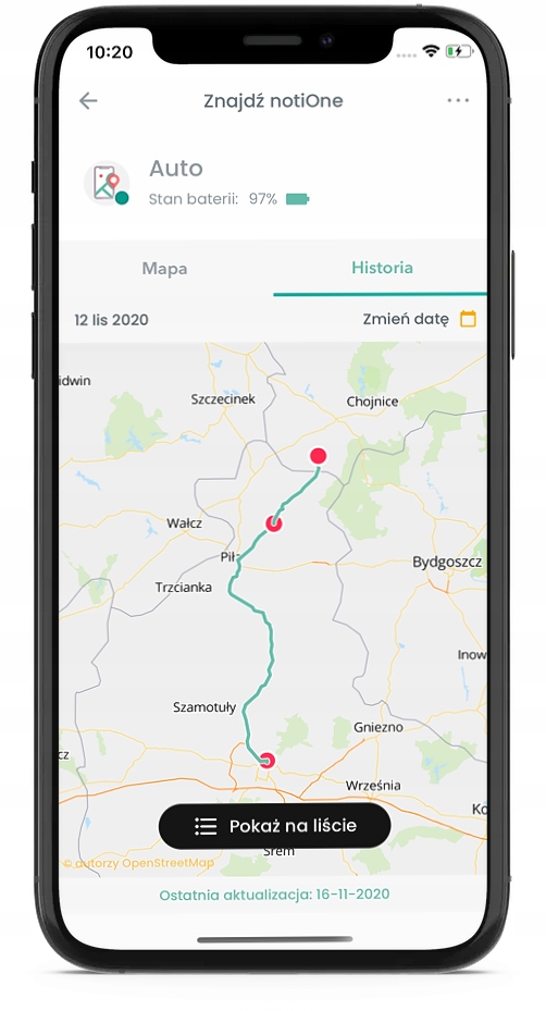 • Маршруты, точки, время и скорость — четкие данные на карте в приложении notiOne.