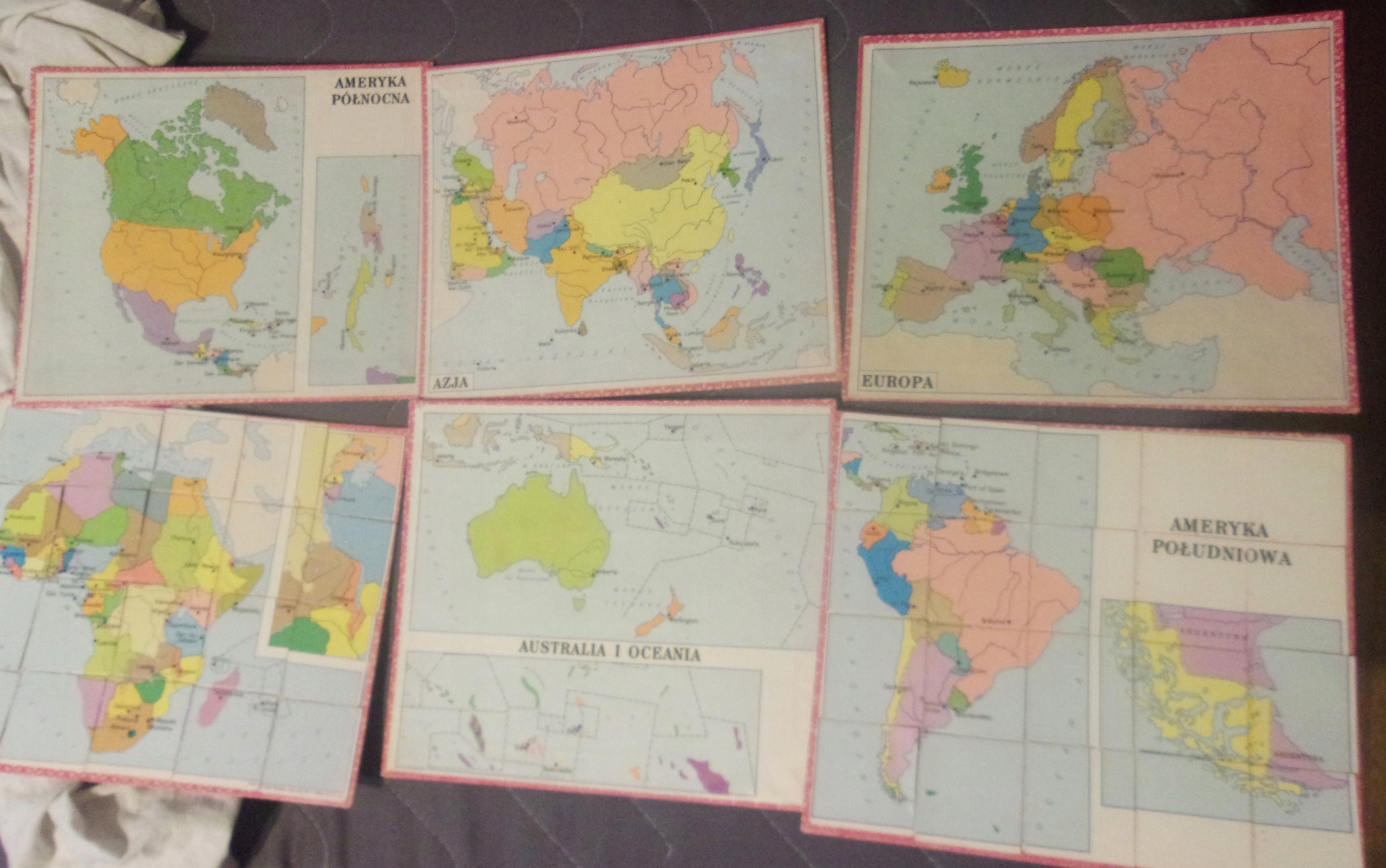 Он состоит из 6 досок с картами, на которых размещены вырезанные листы бумаги с фрагментами вырезанных карт (как сегодняшние пазлы - но без тех разъемов, которые есть в пазлах - потому что в то время в Польше не было оборудования для изготовление (вырезание) пазлов