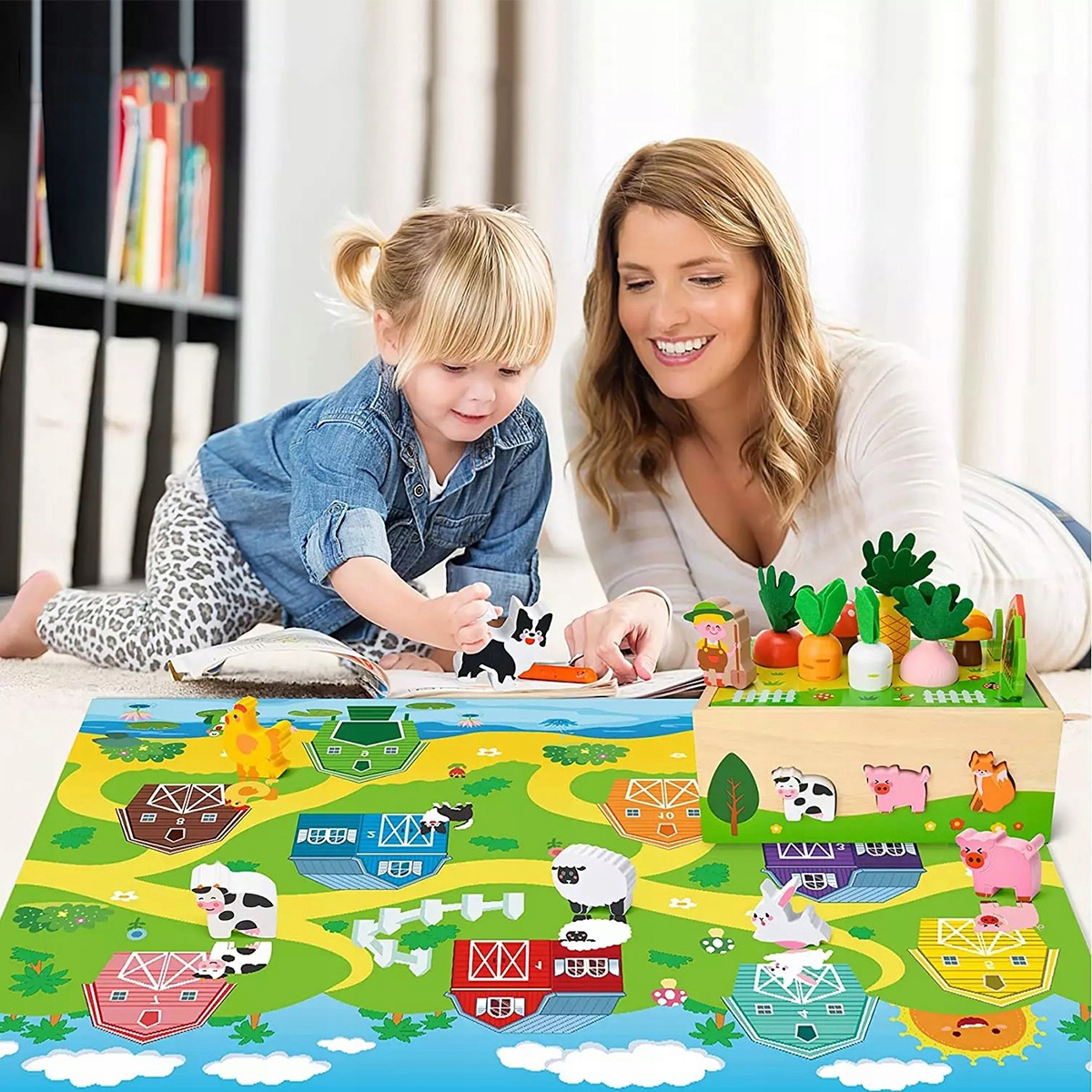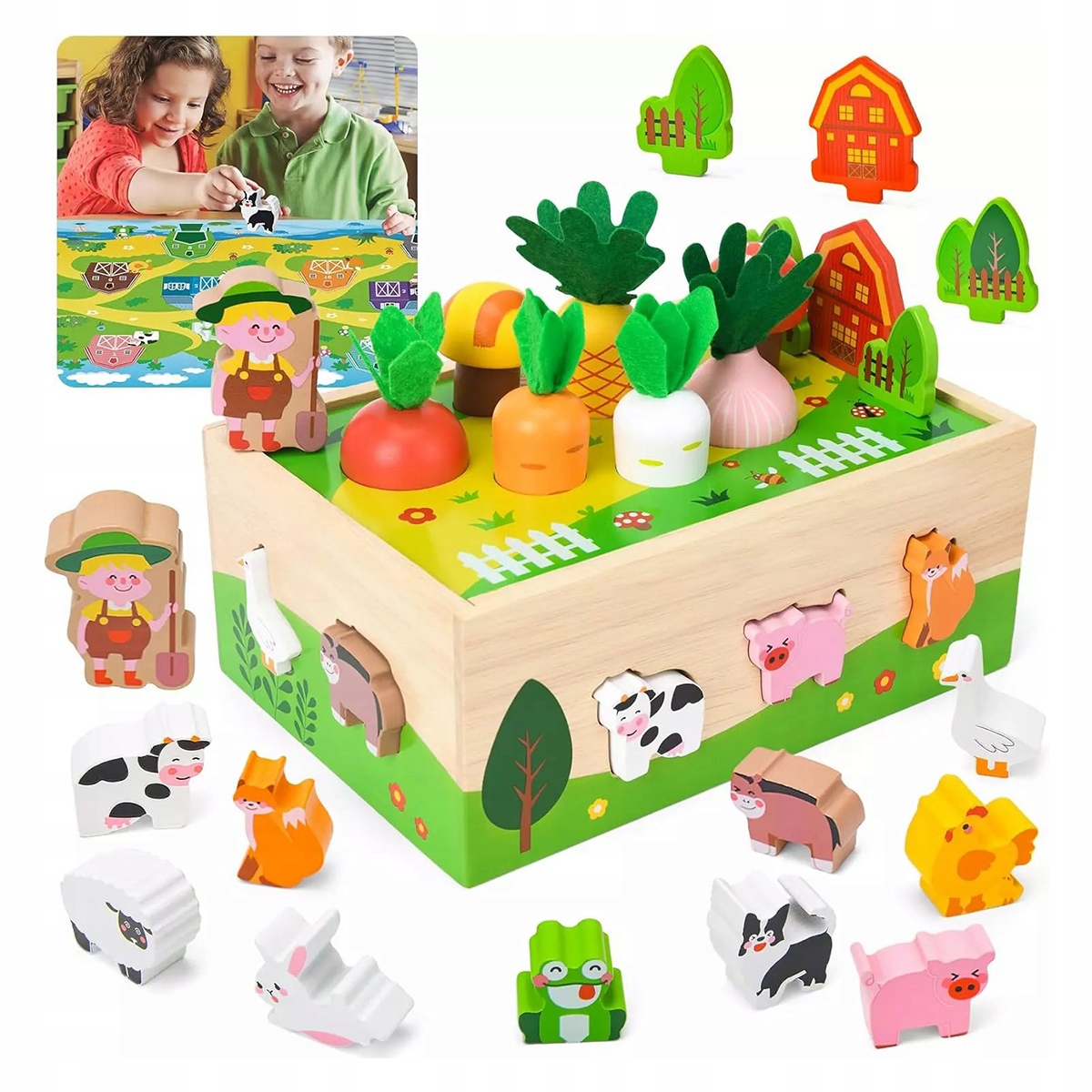 Эта деревянная игрушка в форме фермы предназначена для детей в возрасте 1, 2 и 3 лет. В набор входят 10 животных, 7 овощей, 3 вставки на фермерскую тематику, 1 деревянная основа, 1 фермер и 1 игровой коврик. Она стимулирует воображение и развивает практические навыки детей путем классификации форм, цветовых категорий и распознавания животных.
