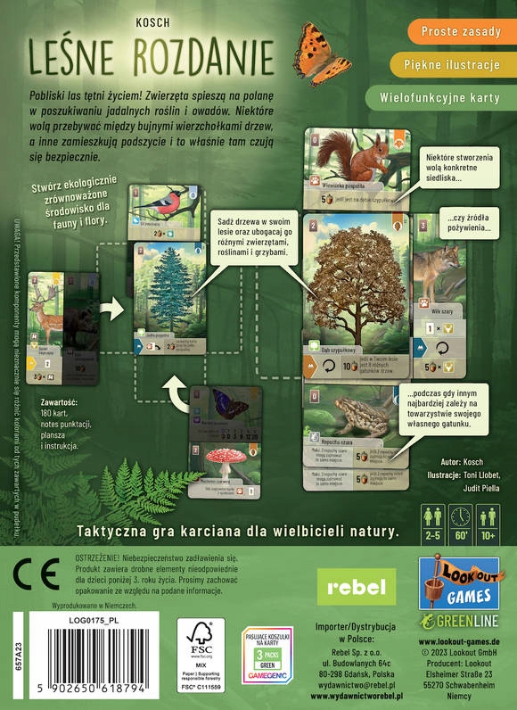Тактическая карточная игра для любителей природы близлежащей леса изобилует жизнью! Животные спешат поляну в поисках съедобных растений и насекомых. Некоторые предпочитают оставаться между пышными побережьями, а другие населяют подрост, и именно здесь они чувствуют себя в безопасности. Лесная дистанция - это карточная игра с простыми принципами и множеством стратегических возможностей. Во время игры ваша цель - создать экологически сбалансированную среду для фауны и флоры. Игра деревьев расширит ваш лес, который вы можете дополнительно обогатить различными животными, растениями и грибами. Если вы уважаете предпочтения жителей леса, вы получите еще больше очков. Помните, что некоторые существа предпочитают компанию своего собственного вида, в то время как другие больше всего заботятся о конкретной среде обитания или пищи. О чем это? Игроки играют свою очередь, играя в лесное расстояние. Во время каждого из них мы выполняем 1 из 2 возможных действий: мы выбираем 2 карты. Мы играем на карту и проверяем бонусы на нашей очистке. Среди карт мы найдем деревья и животных. Первое составляет основу нашего леса - мы можем разыграть вокруг них различные виды. В свою очередь, карты животных делятся, и каждый раз, когда мы выбираем, какую сторону мы хотим использовать. Ключ к победе состоит в том, чтобы правильно разложить животных в соответствии с их предпочтениями в отношении окружающей среды и окружающей среды, тщательное сочетание влияющих эффектов, а также максимальное использование опции сбора наборов. Почему вам понравится эта игра? Хотя сам игровой механизм прост, лесное расстояние является многомерным стратегическим весельем. На картах мы найдем много символов, эффектов и зависимостей, которые влияют друг на друга. Во время игры мы должны решить, что будет для нас самым прибыльным. Множество доступных карт и их многофункциональность, а также нестандартный обратный отсчет до конца игры делают их не двумя идентичными сторонами, а участники каждый раз ставят новые проблемы. Информация о картах о животных, растениях, грибах и их предпочтениях вдохновлена реальной информацией о отдельных видах, благодаря которой игра имеет дополнительную образовательную ценность. Содержание: 180 ноутбуков.