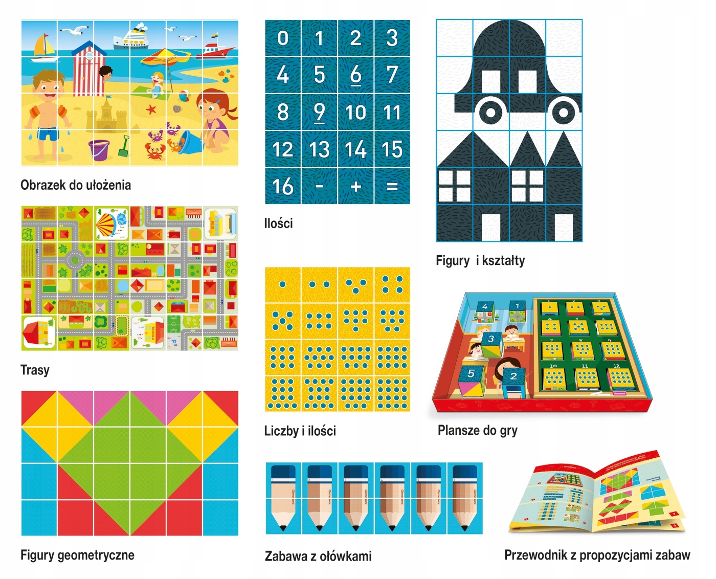 Стимулирует наблюдательность, учит детей считать, сопоставлять числа и количества, решать первые уравнения и заново составлять изображения и пути.
